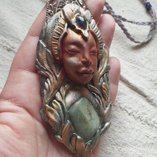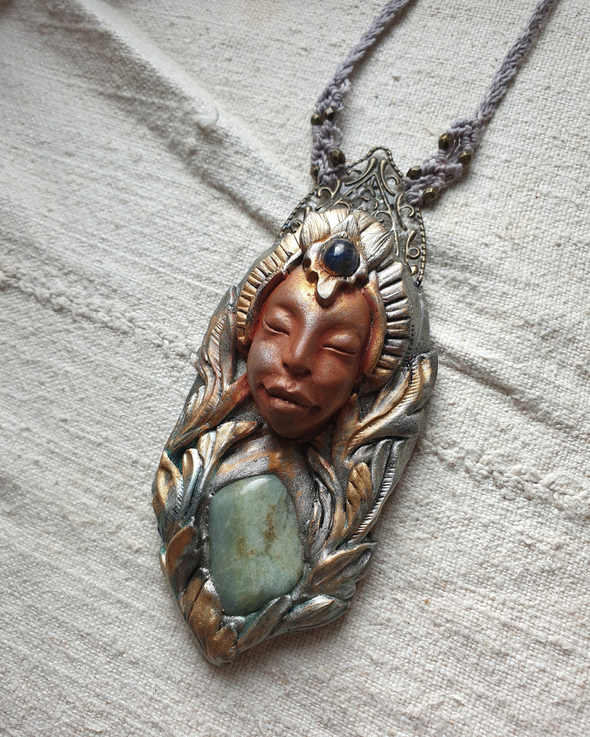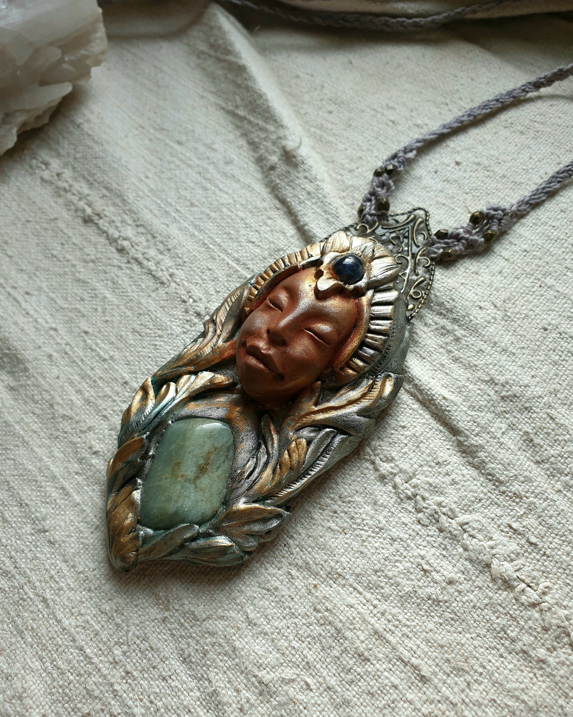 Unikatni ručno izrađeni privjesak od polimerske gline, akvamarina,kijanita, metalnih detalja i zaštitnog sloja epoxy smole, postavljen na ručno pletenu makrame ogrlicu. Svaki komad pažljivo je modeliran i oslikan, što ga čini potpuno jedinstvenim.