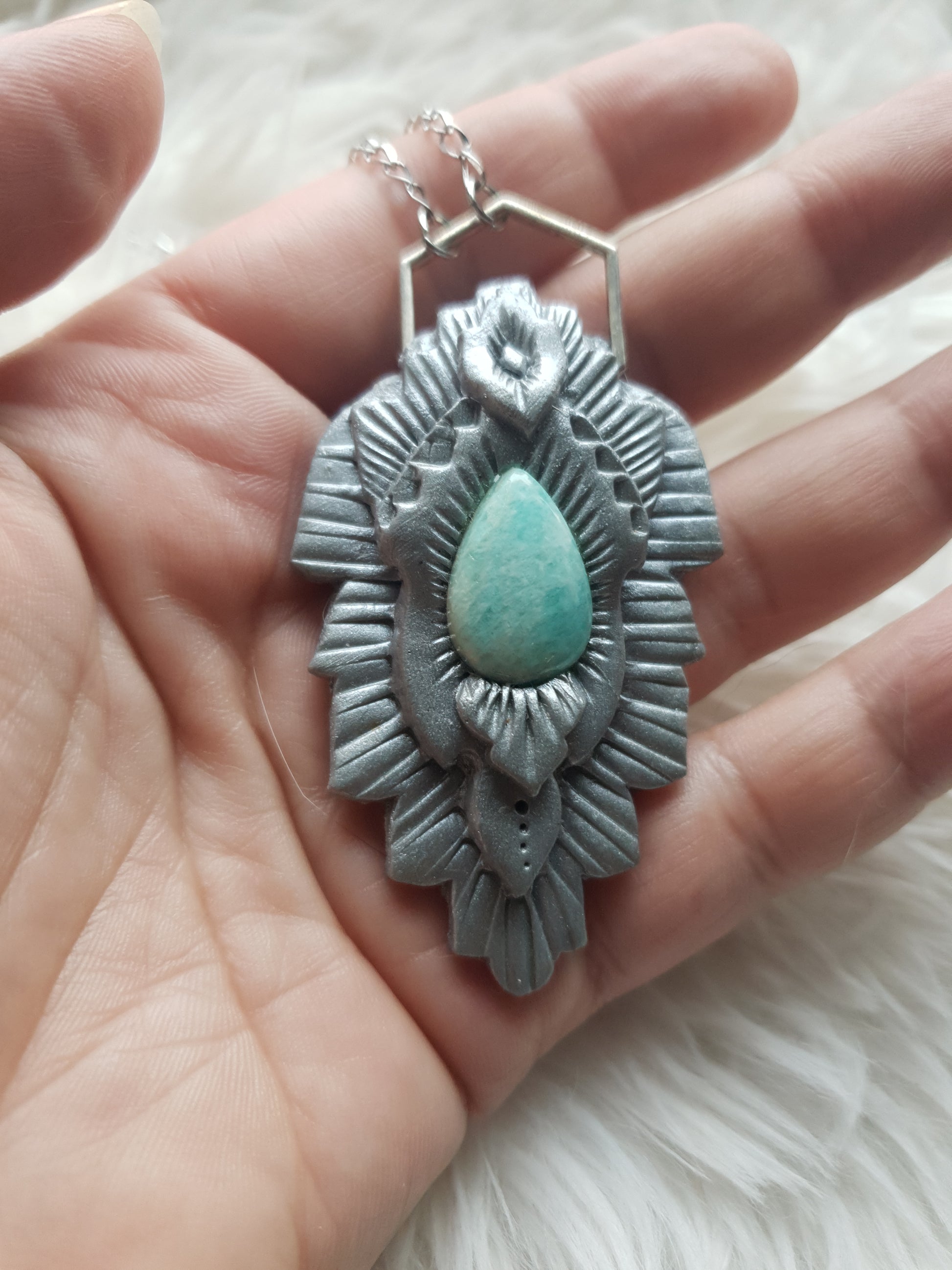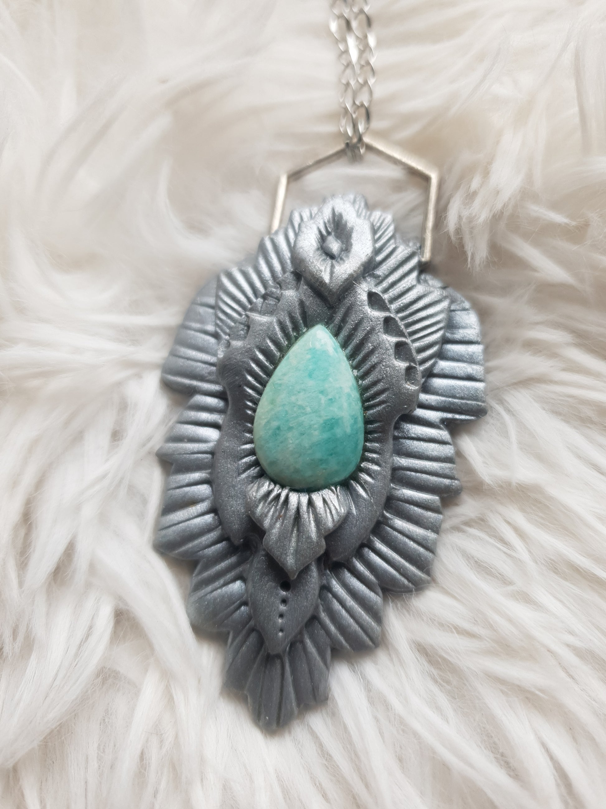 Unikatan ručno oblikovan privjesak od polimerske gline i amazonita.
