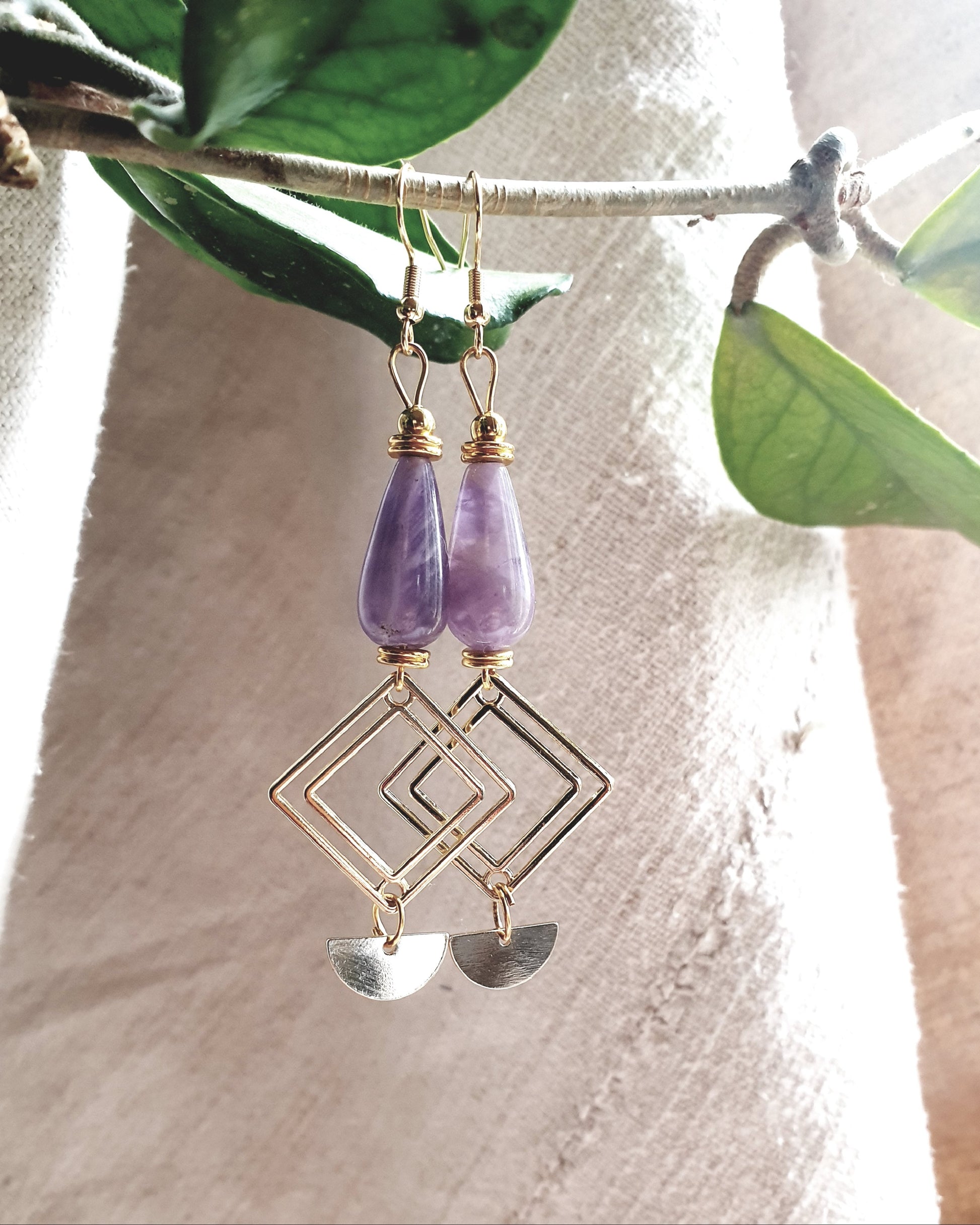 Ručno izrađene naušnice kombinirane od pomno odabranih elemenata i ametista. Lagane, udobne .