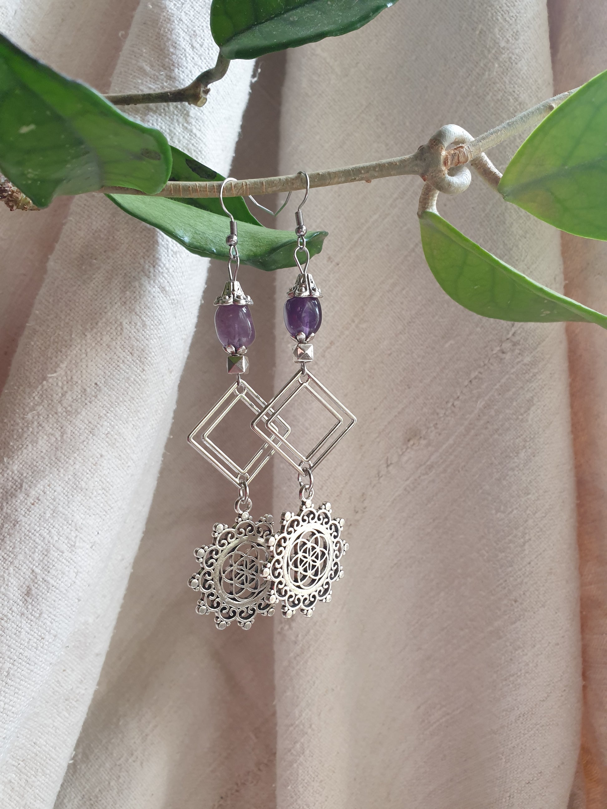 Ručno izrađene naušnice kombinirane od pomno odabranih elemenata i ametista. Lagane, udobne .