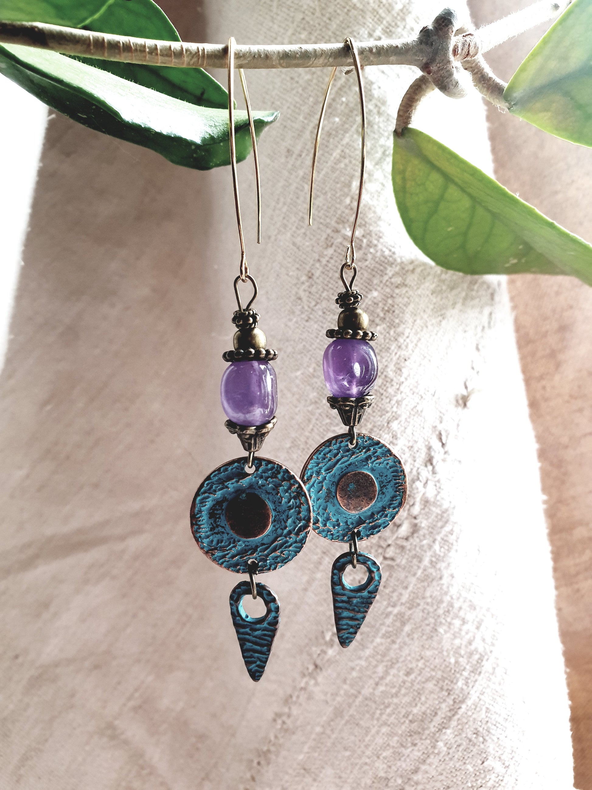 Ručno izrađene naušnice kombinirane od pomno odabranih elemenata i ametista. Lagane, udobne .