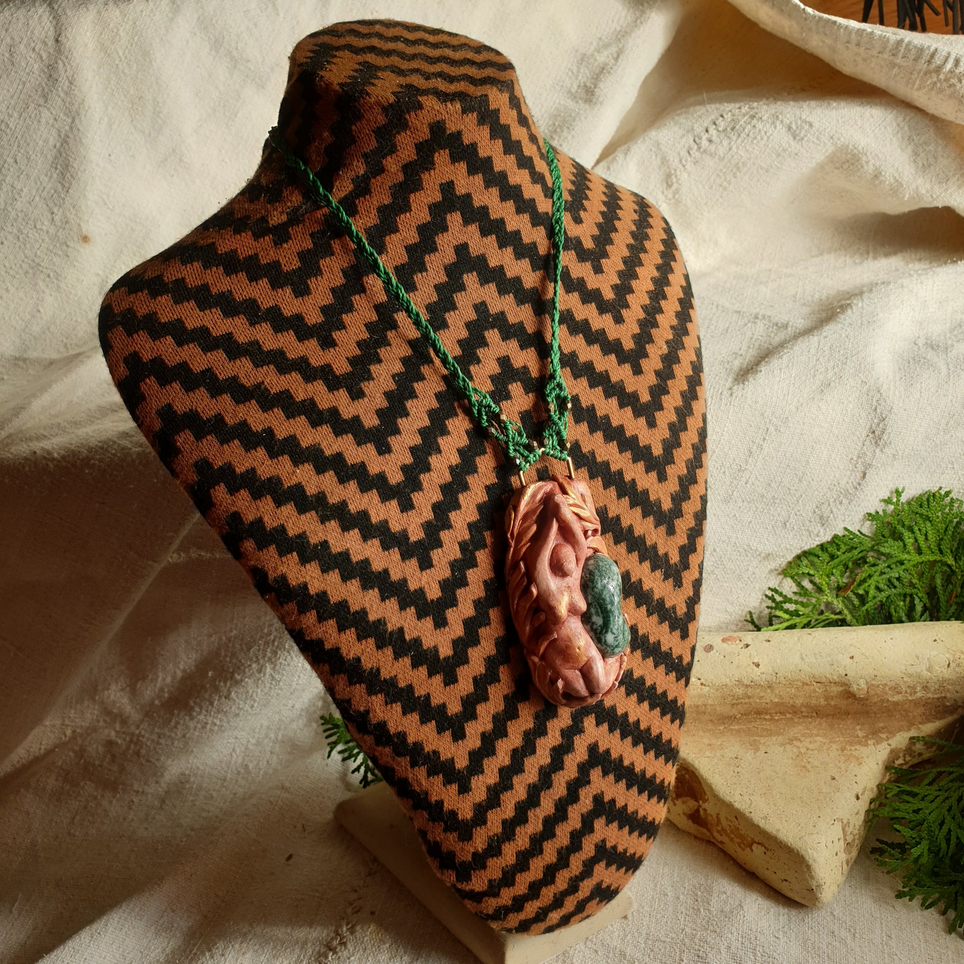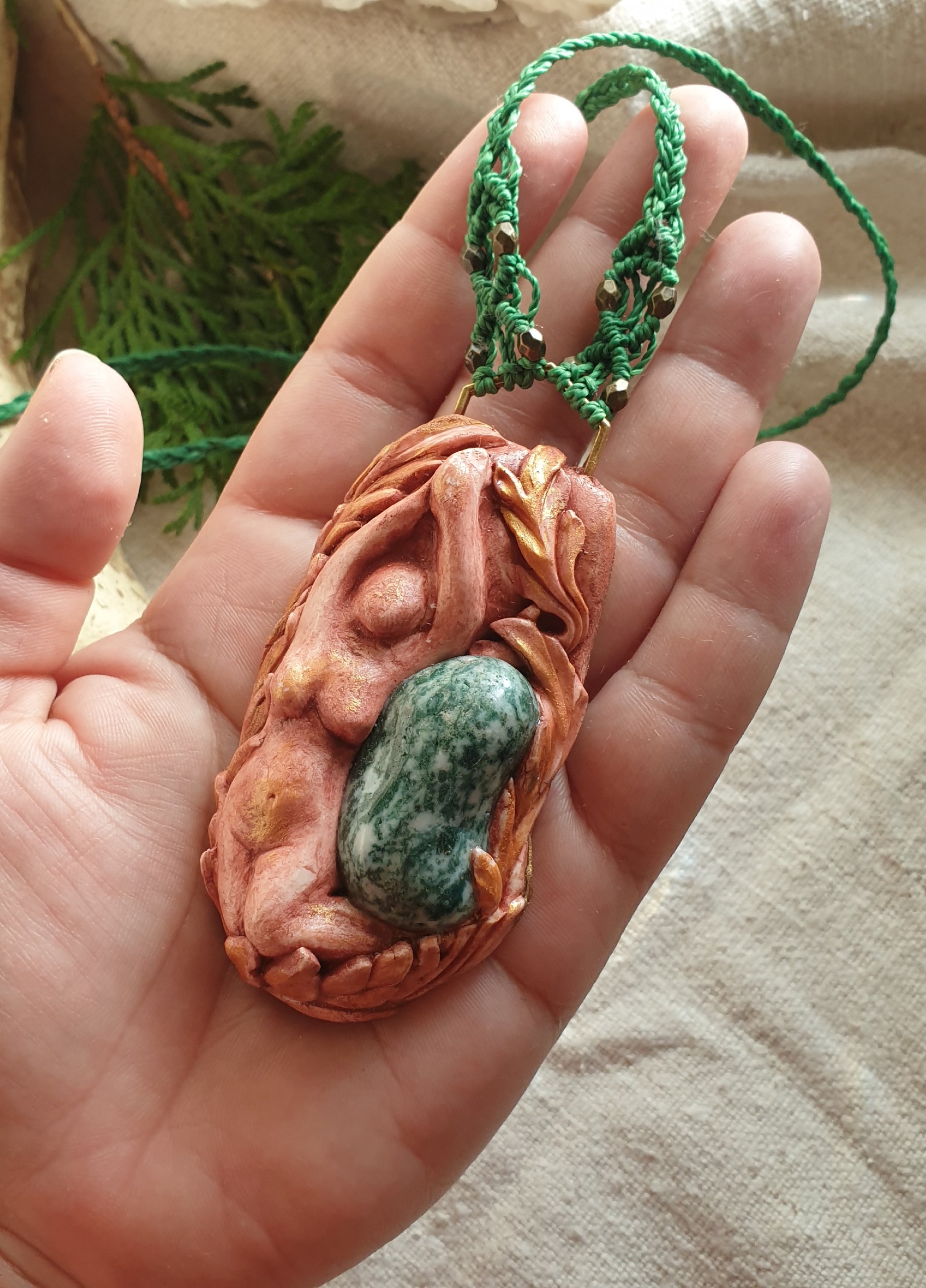 Ručno izrađen privjesak inspiriran boginjom - bereginjama, oblikovan od polimerske gline i mahovinskog ahata .