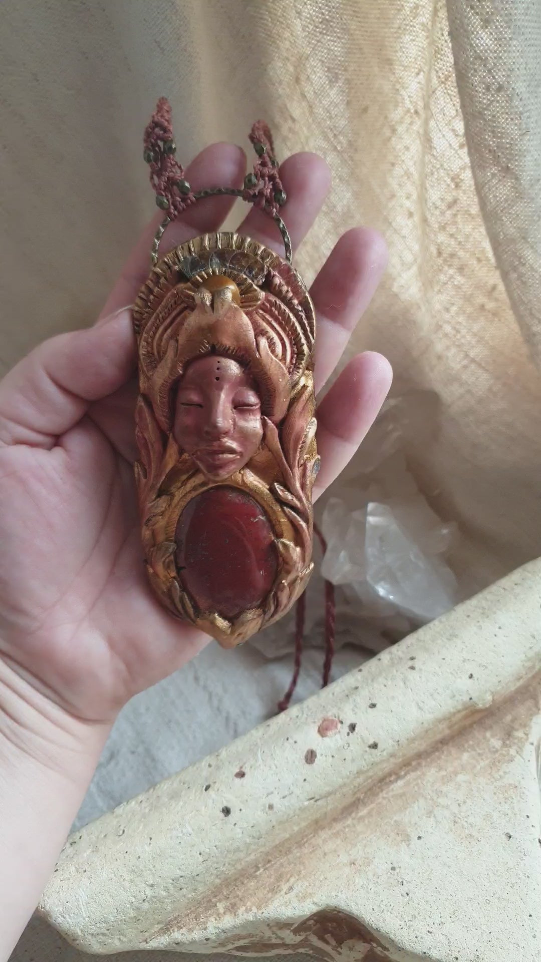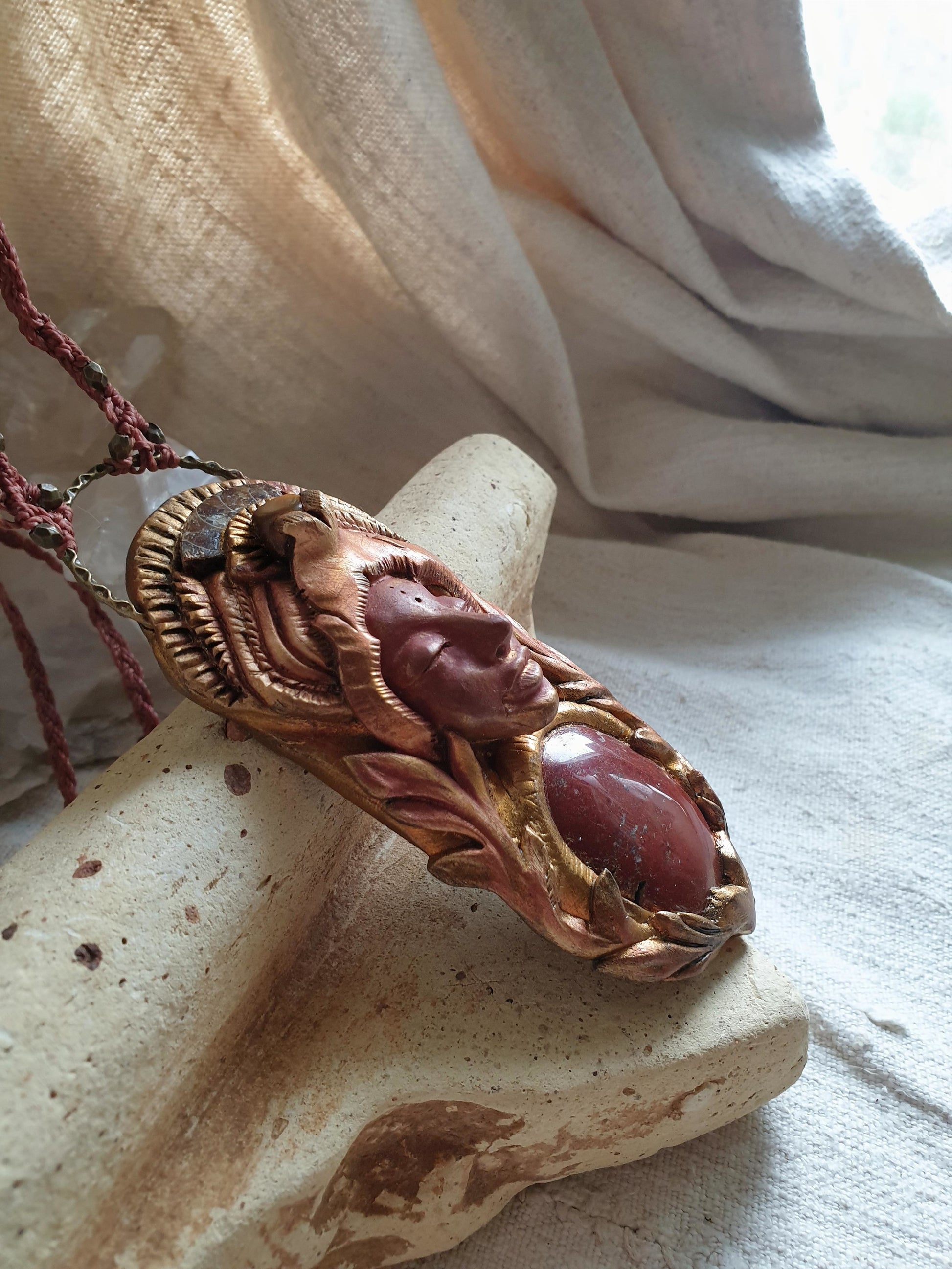 Unikatni ručno izrađeni privjesak od polimerske gline,crvenog jaspisa,amonita i tigrovog oka i zaštitnog sloja epoxy smole, postavljen na ručno pletenu makrame ogrlicu. Svaki komad pažljivo je modeliran i oslikan, što ga čini potpuno jedinstvenim.
