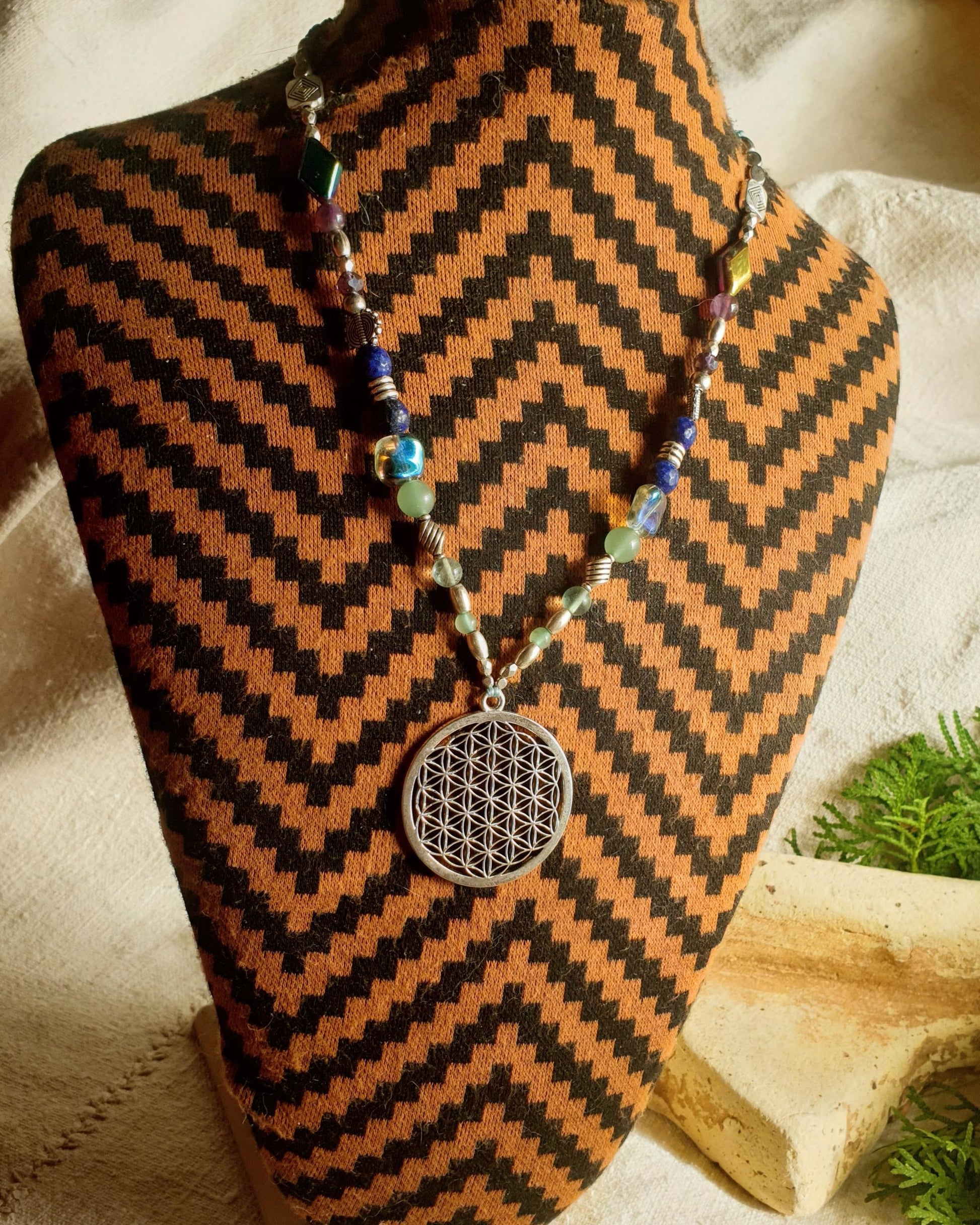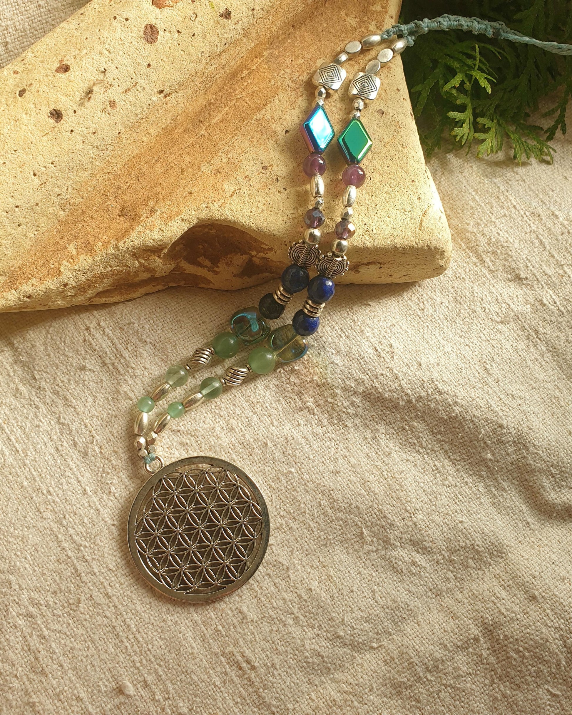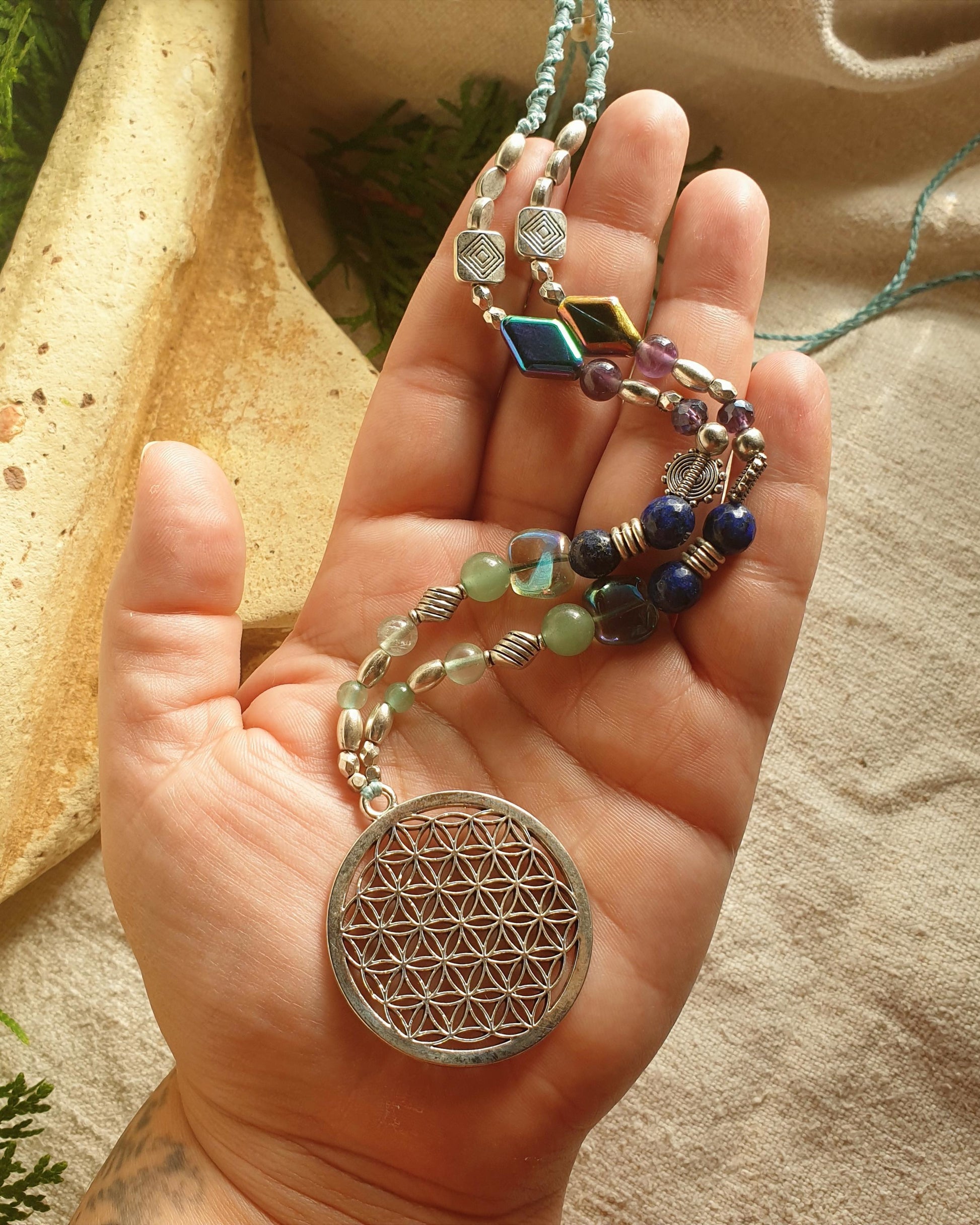 Ogrlica cvijet života, izrađena kombinacijom kristalnih i staklenih perlica, metalnih elemenata od cinka i tibetanskog srebra te makrame voštanog konca. Svaki komad pažljivo je ručno složen i jedinstven u detaljima i boji.