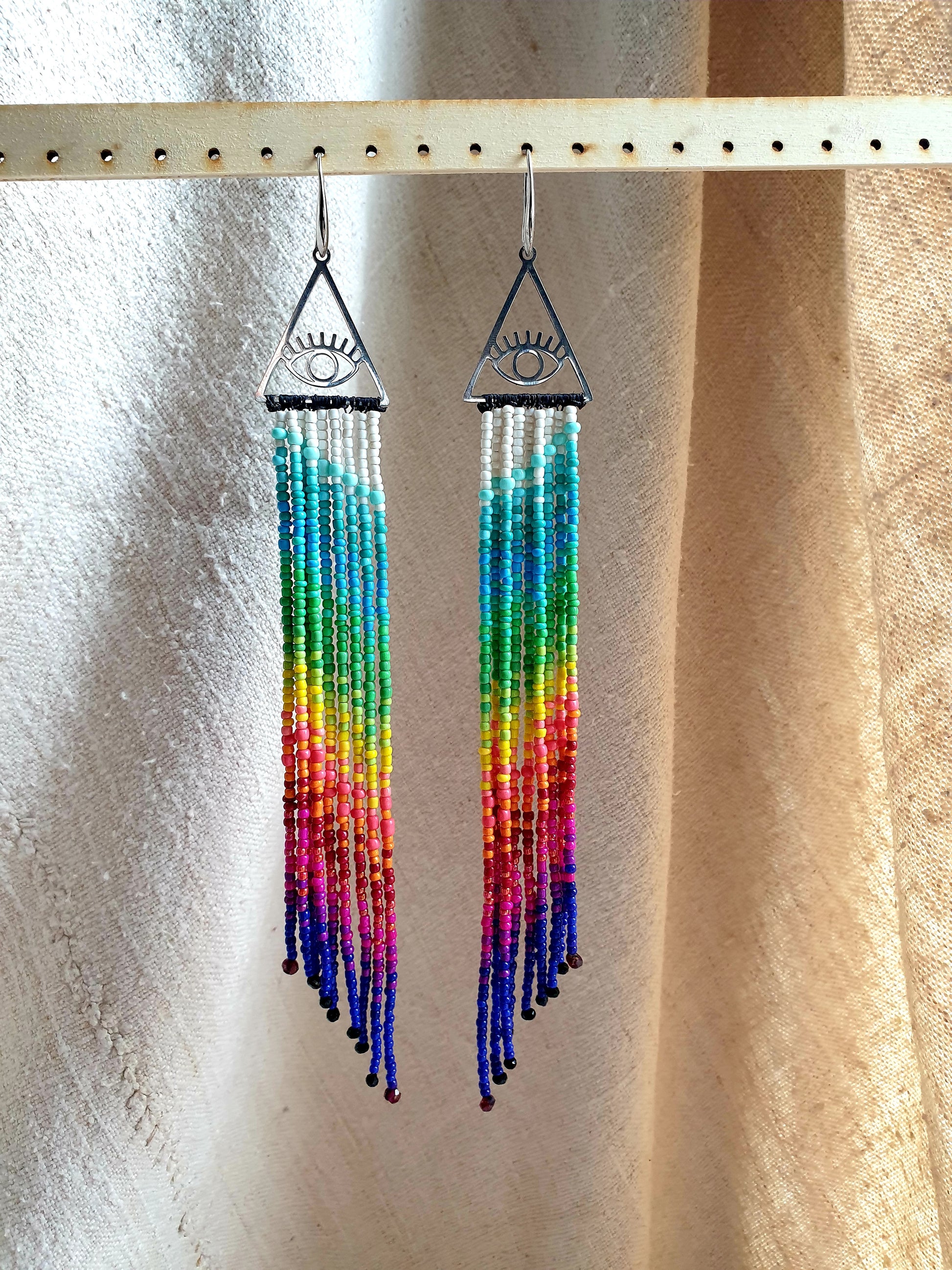 Ručno izrađene viseće naušnice kombinirane od staklenih perli, prirodnog granata i komponenti od nehrđajućeg čelika. Lagane, izdržljive i idealne za svakodnevno nošenje.