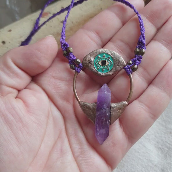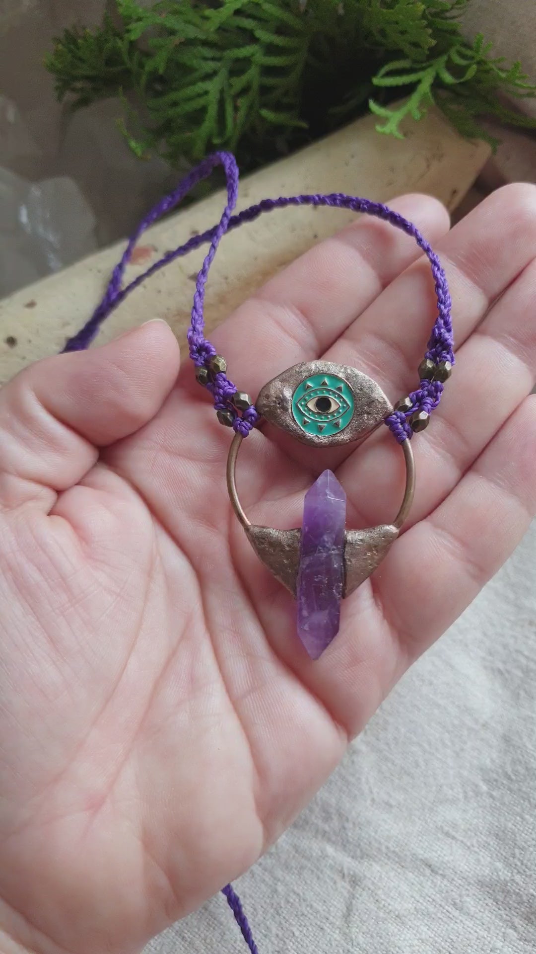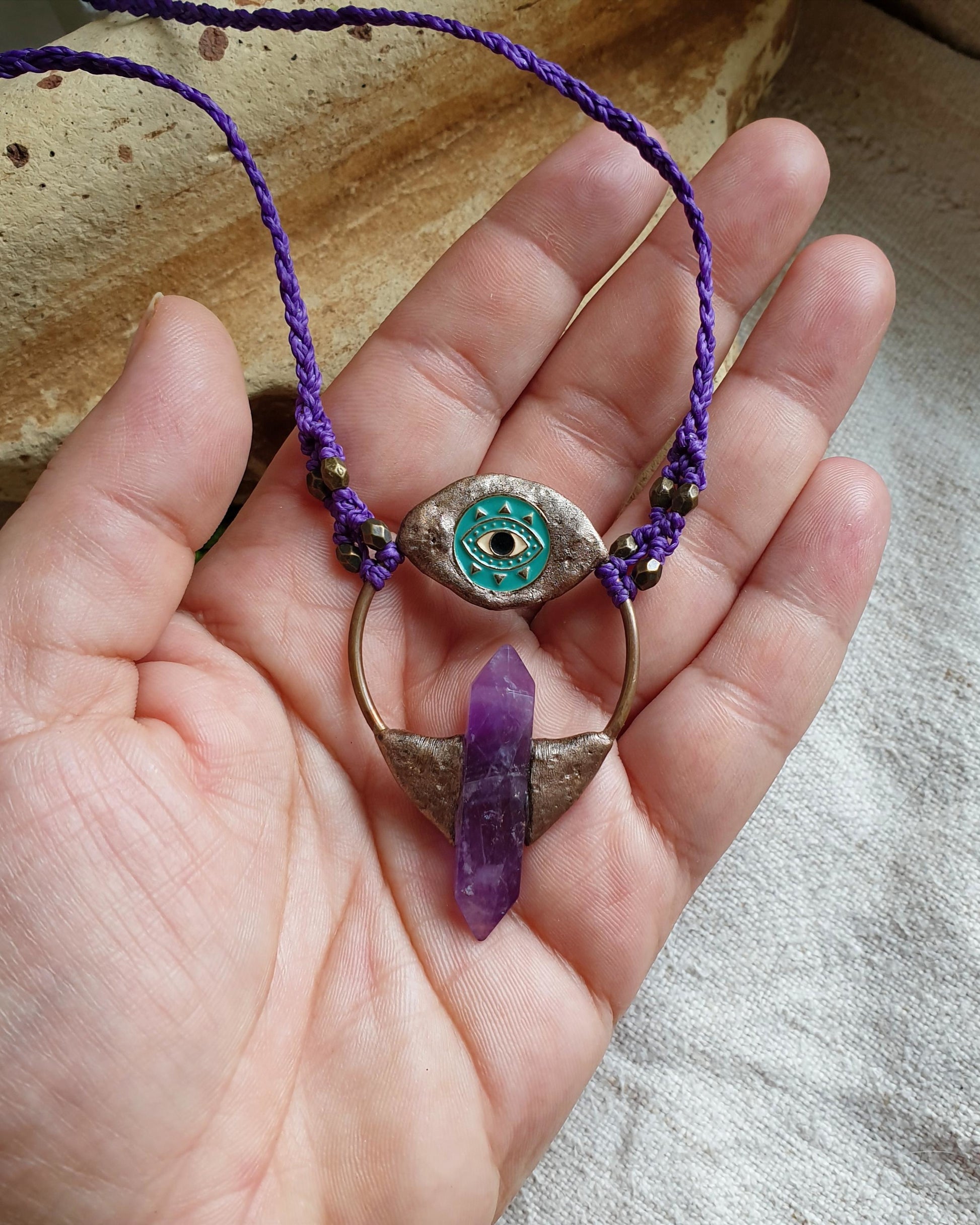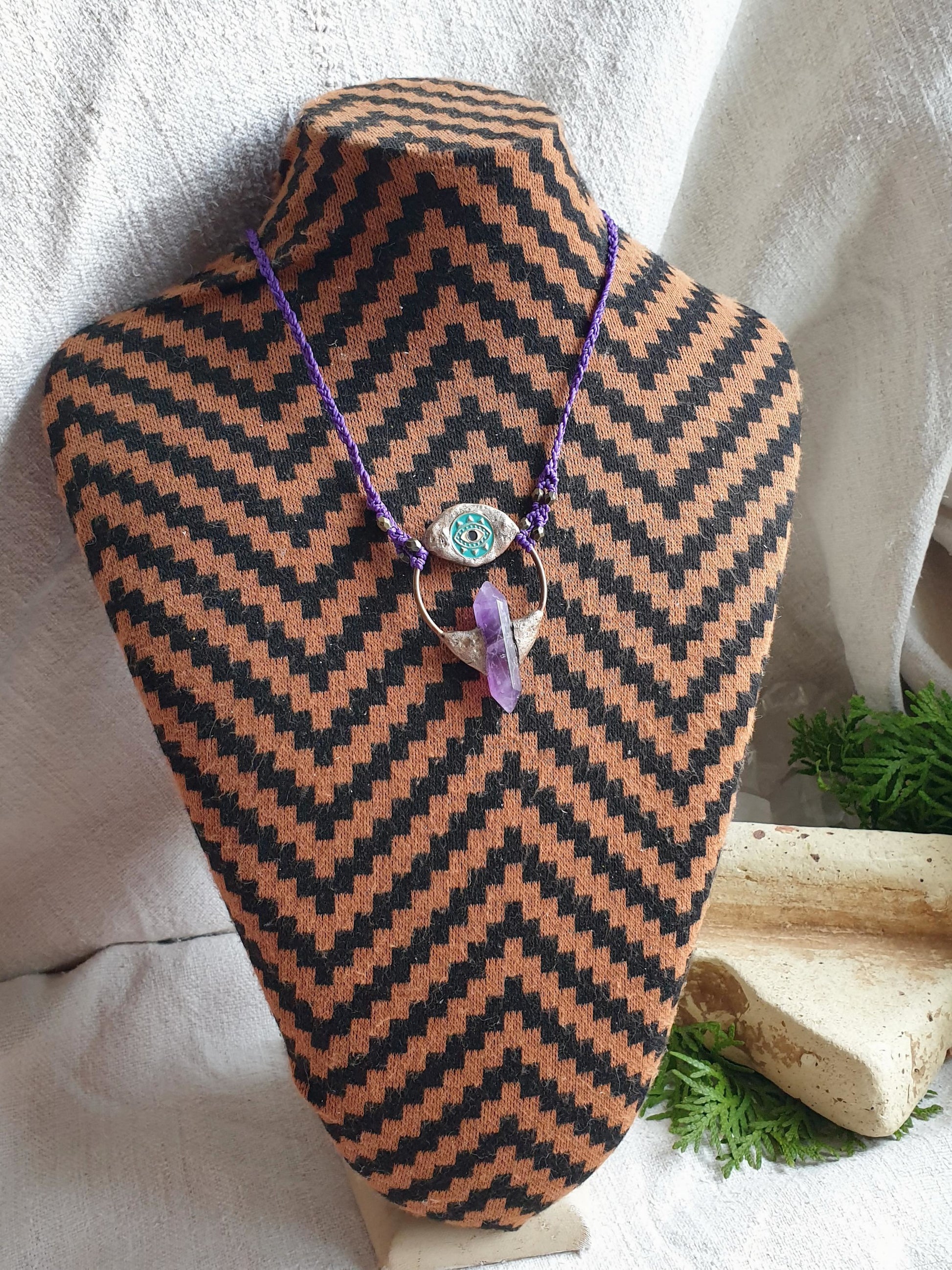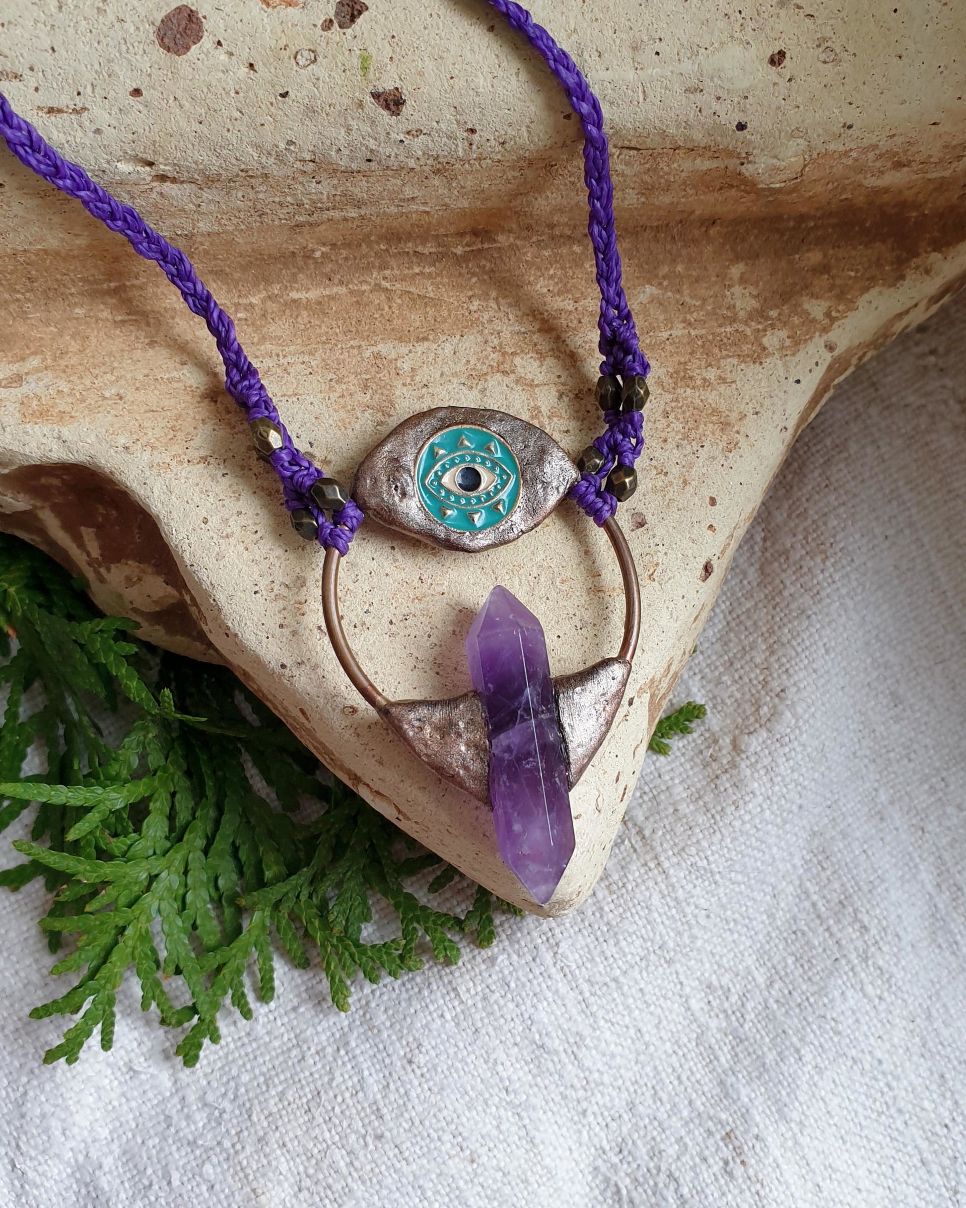 Unikatan nakit, izrađen od polimerske gline i dvostruko terminiranog ametista . Svaki komad je ručno modeliran, te postavljen na makrame ogrlicu od kvalitetnog voštanog konca. Jedinstven spoj prirodnih elemenata, ručne izrade i organske estetike.