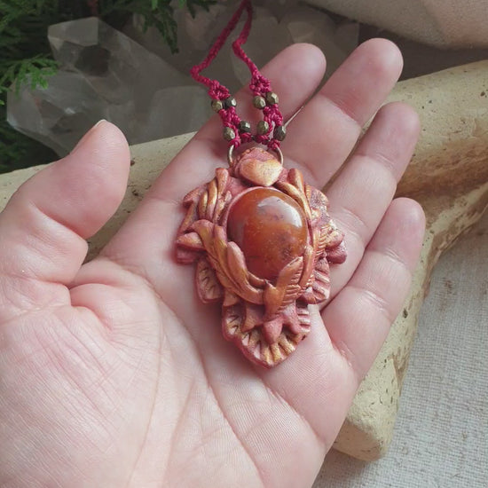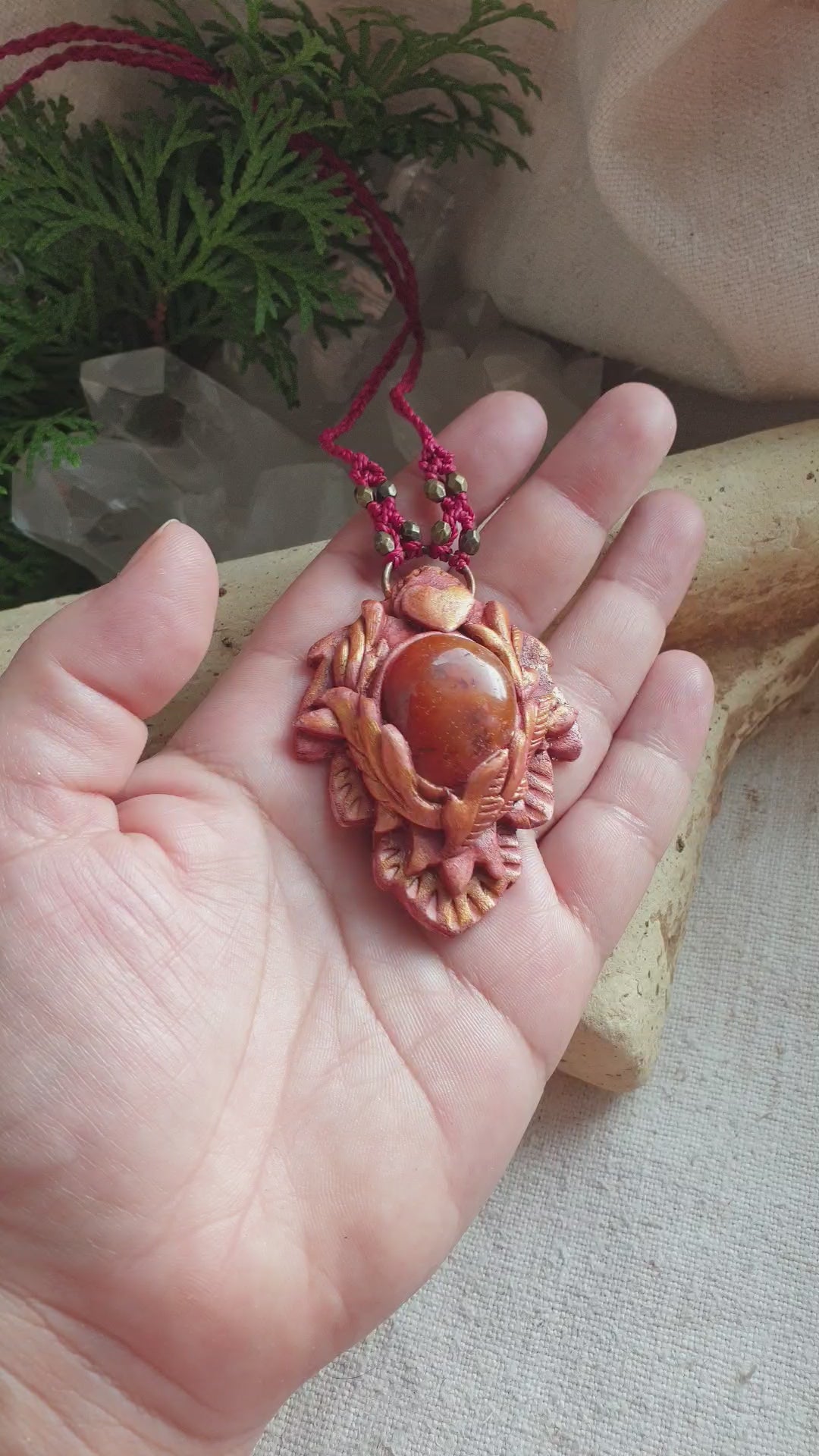 Unikatan nakit, izrađen od polimerske gline i karneola. Svaki komad je ručno modeliran, te postavljen na makrame ogrlicu od kvalitetnog voštanog konca. Jedinstven spoj prirodnih elemenata, ručne izrade i organske estetike.