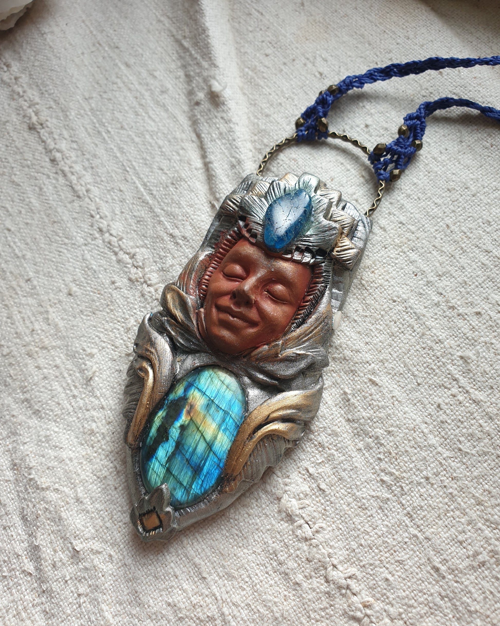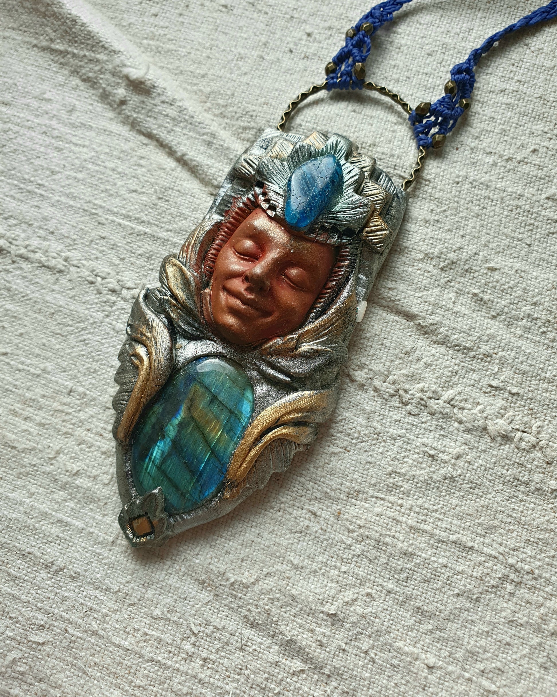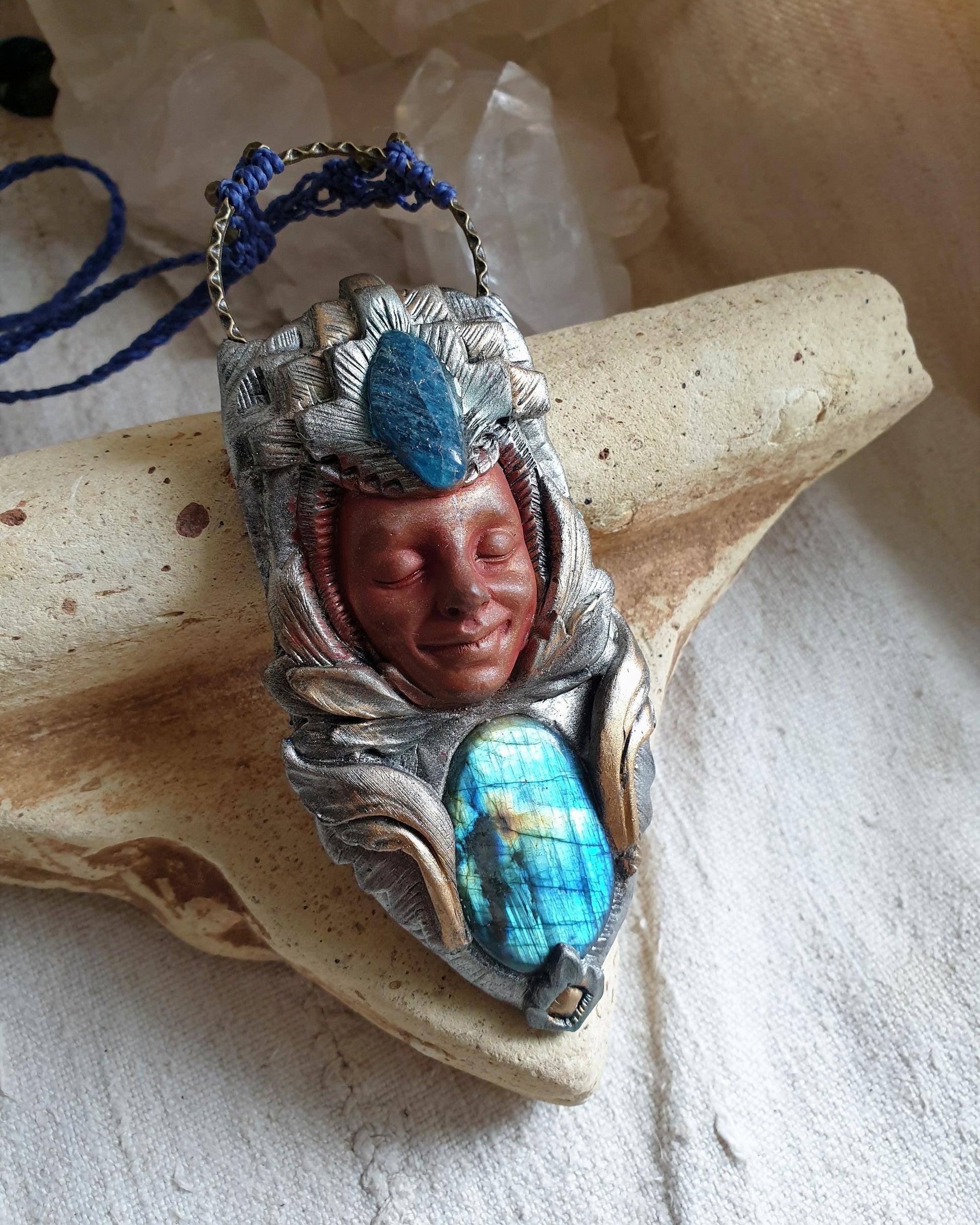 Unikatni ručno izrađeni privjesak od polimerske gline,plavog labradorita, apatita i zaštitnog sloja epoxy smole, postavljen na ručno pletenu makrame ogrlicu. Svaki komad pažljivo je modeliran i oslikan, što ga čini potpuno jedinstvenim.