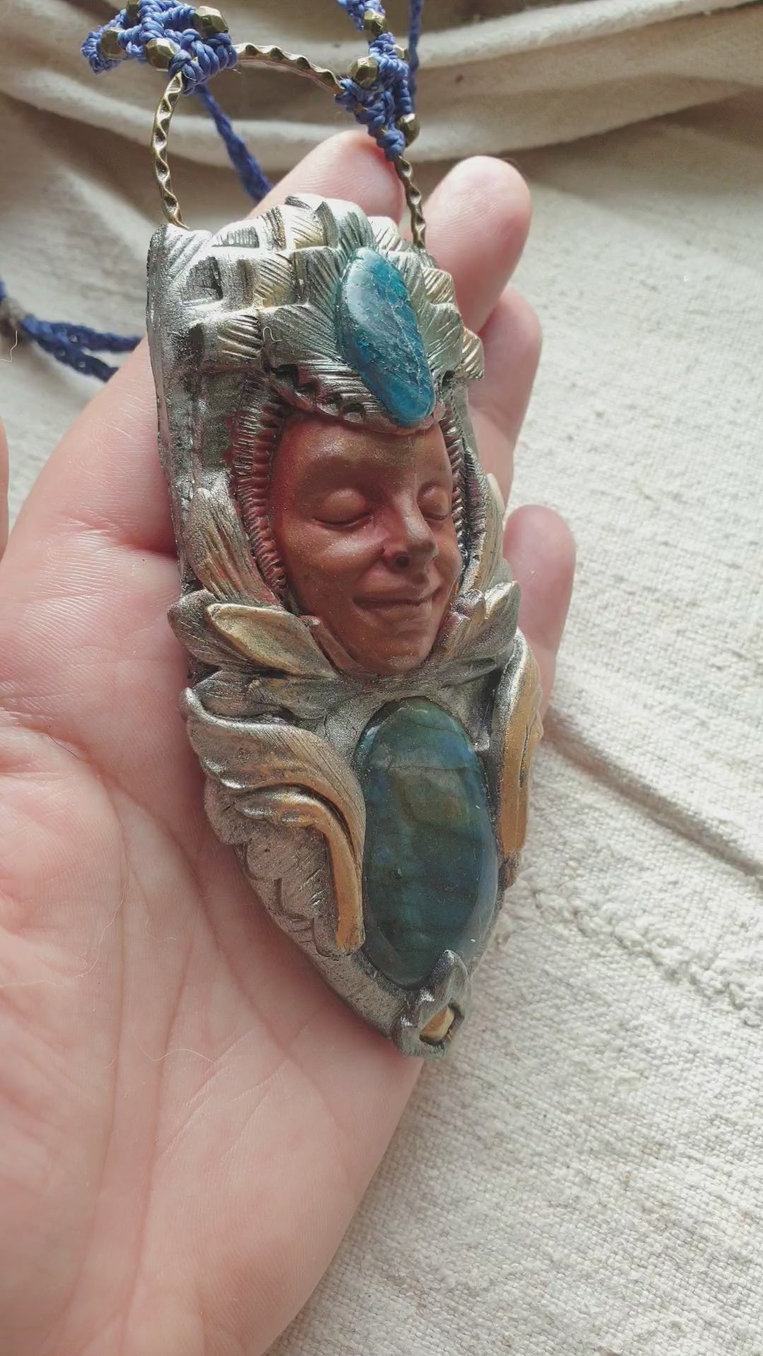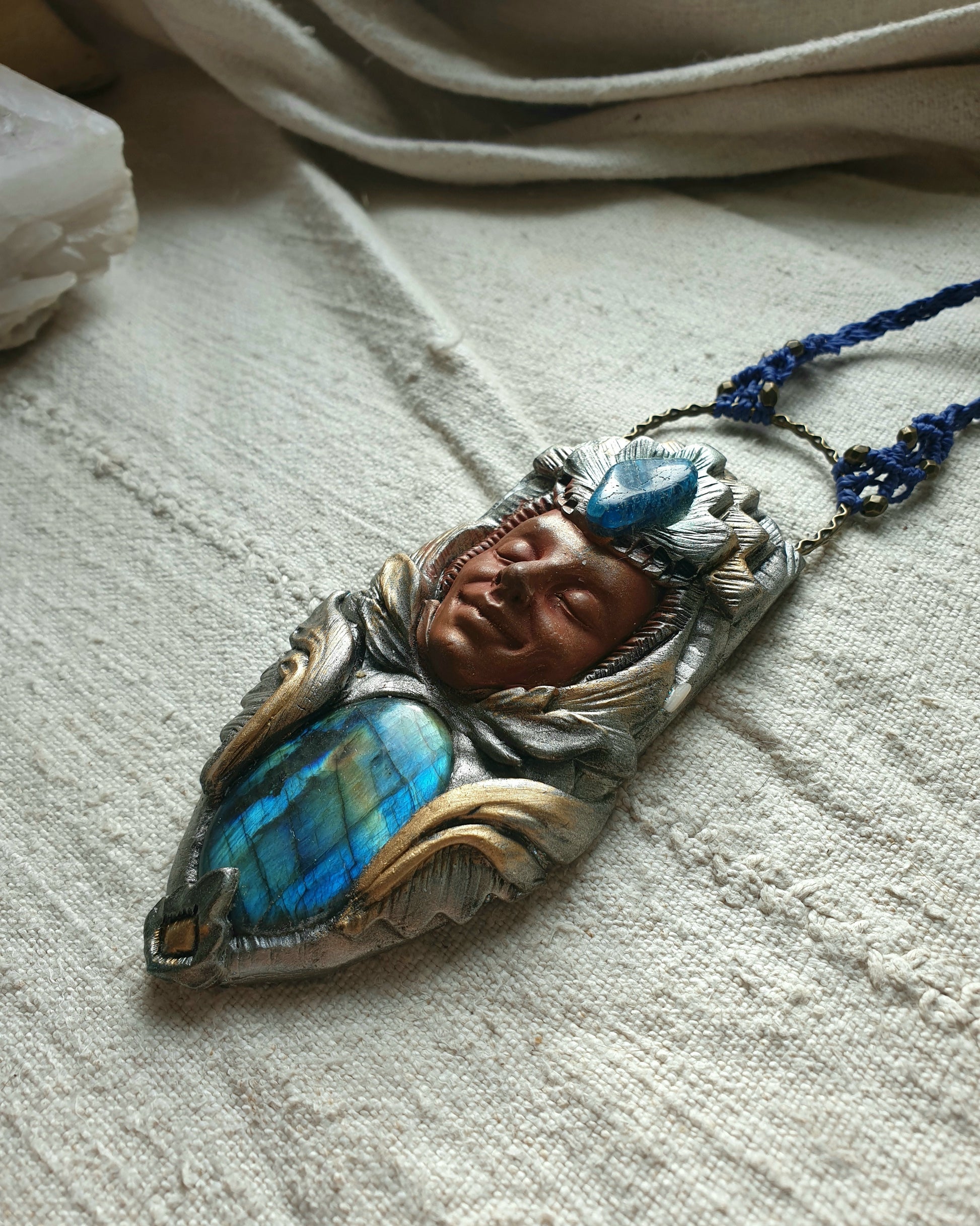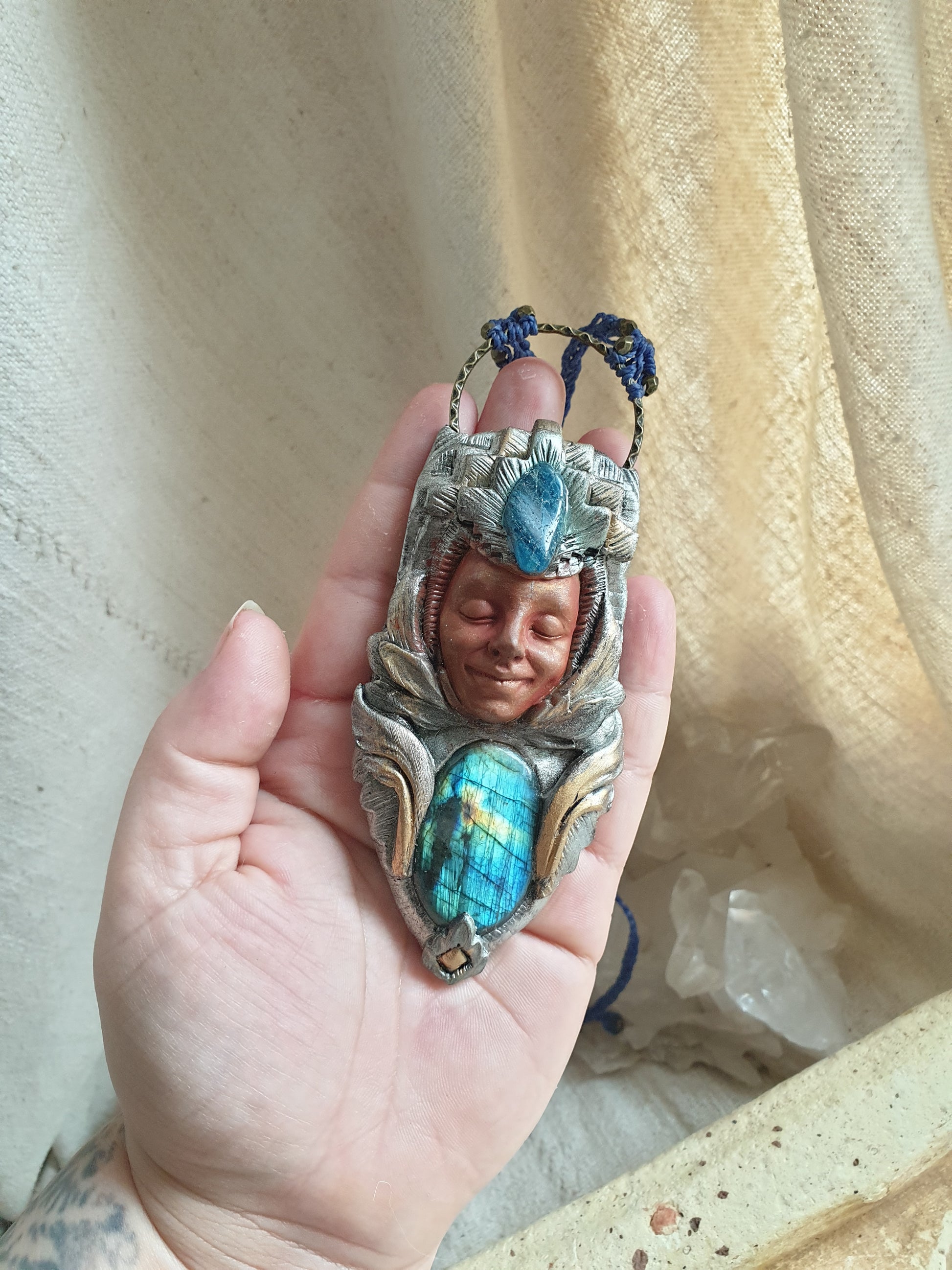Unikatni ručno izrađeni privjesak od polimerske gline,plavog labradorita, apatita i zaštitnog sloja epoxy smole, postavljen na ručno pletenu makrame ogrlicu. Svaki komad pažljivo je modeliran i oslikan, što ga čini potpuno jedinstvenim.