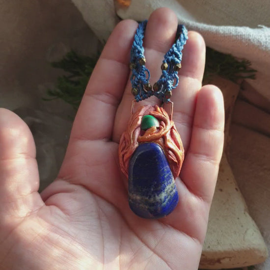 Unikatan nakit, izrađen od polimerske gline lapis lazuli i malahita . Svaki komad je ručno modeliran, te postavljen na makrame ogrlicu od kvalitetnog voštanog konca. Jedinstven spoj prirodnih elemenata, ručne izrade i organske estetike.