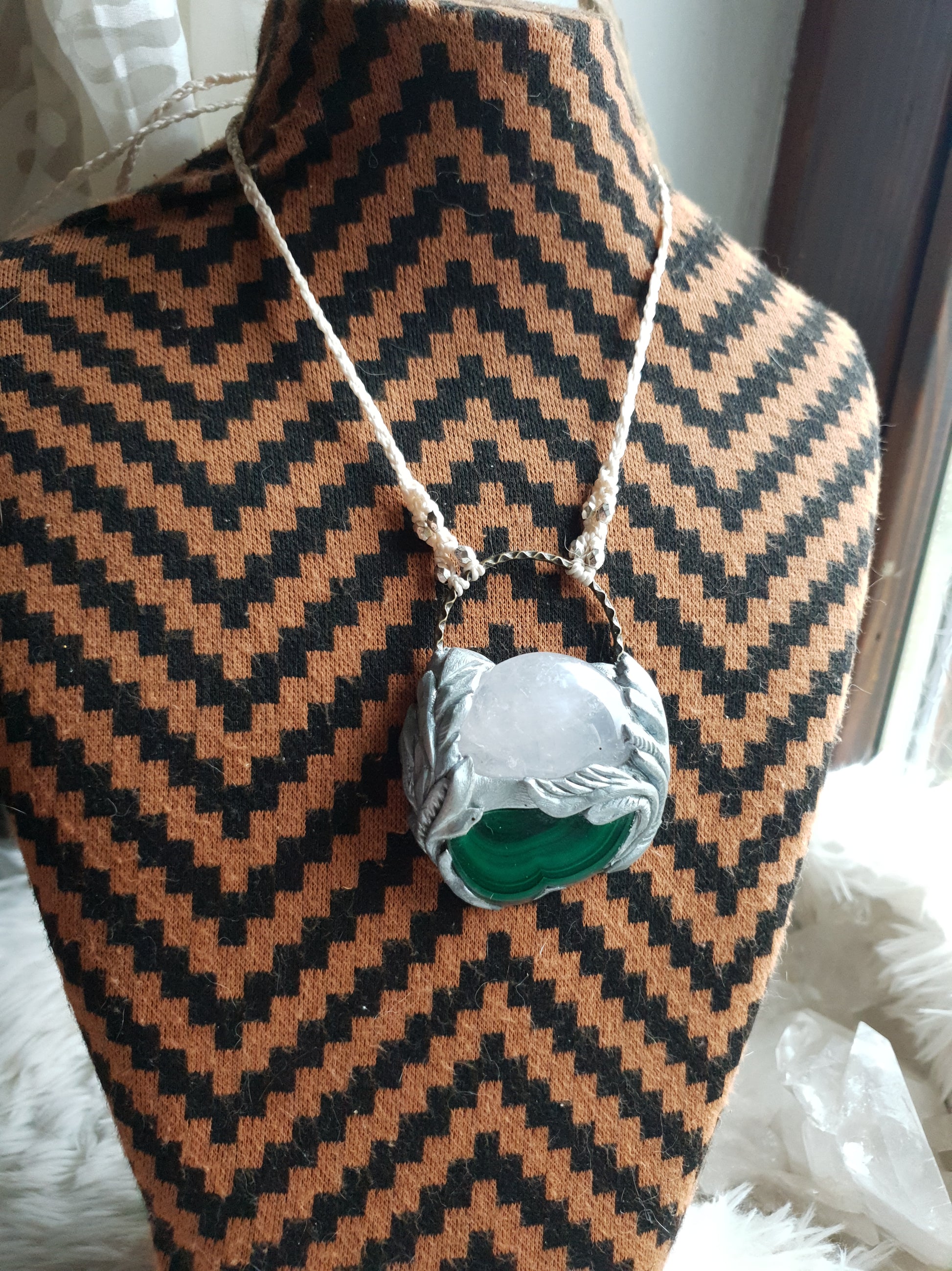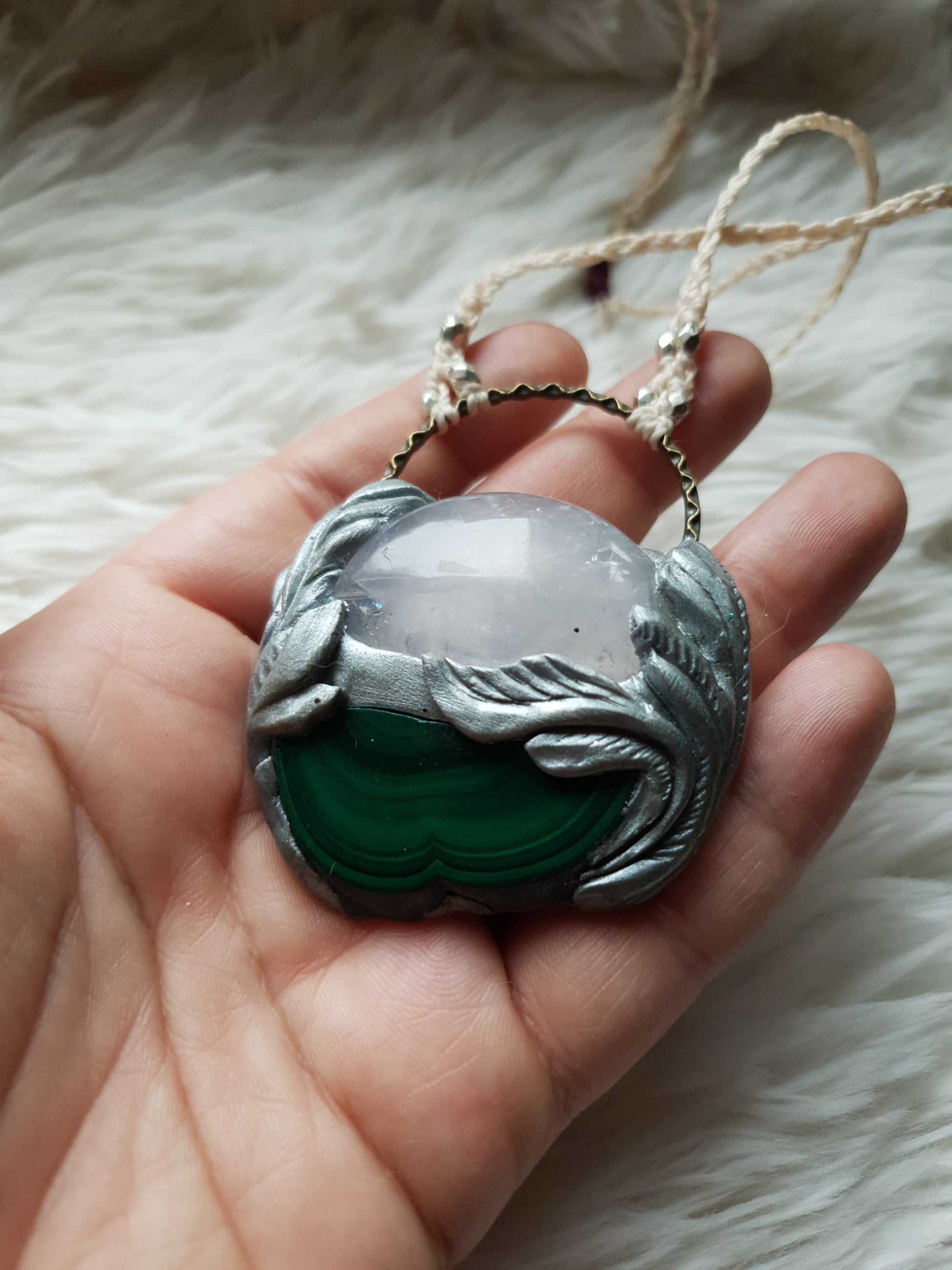 Unikatan nakit, izrađen od polimerske gline malahita i rozen kvarca . Svaki komad je ručno modeliran, te postavljen na makrame ogrlicu od kvalitetnog voštanog konca. Jedinstven spoj prirodnih elemenata, ručne izrade i organske estetike.