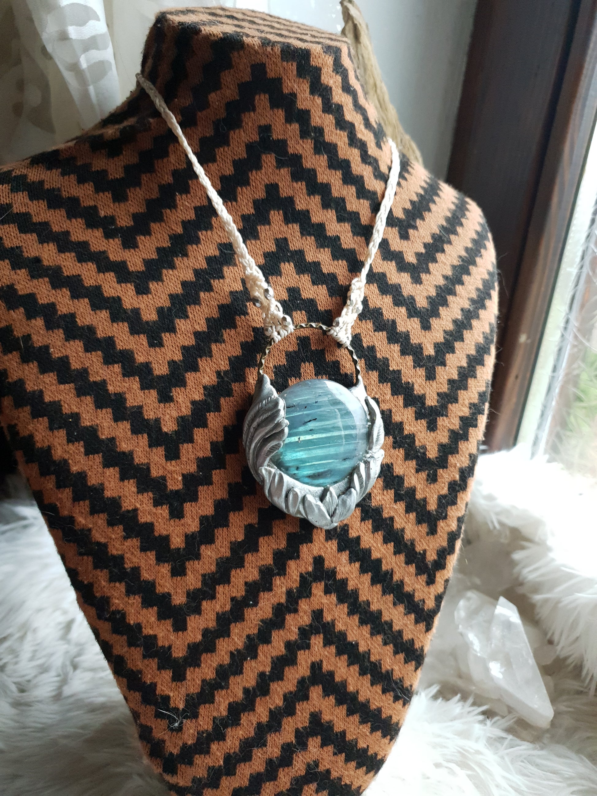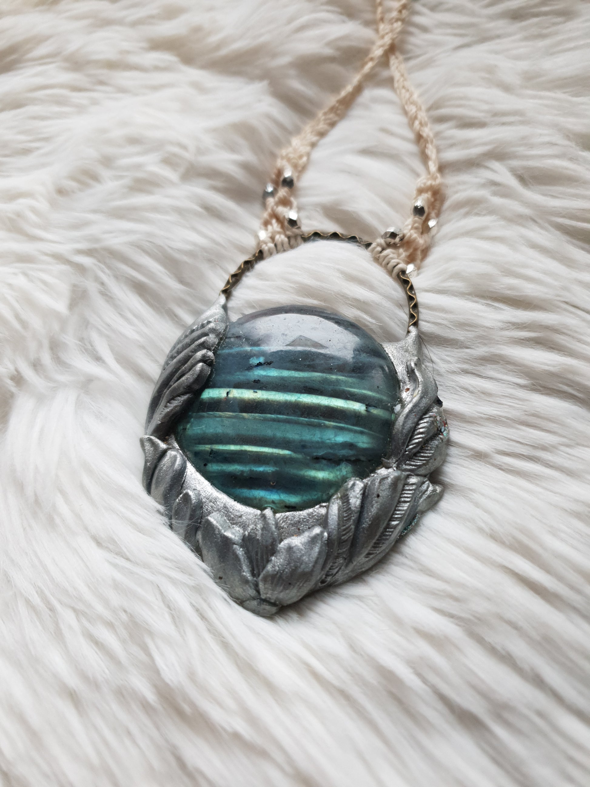 Unikatan nakit, izrađen od polimerske gline i veoma jedinstvenog nebesko plavog labradorita. Svaki komad je ručno modeliran, te postavljen na makrame ogrlicu od kvalitetnog voštanog konca. Jedinstven spoj prirodnih elemenata, ručne izrade i organske estetike.