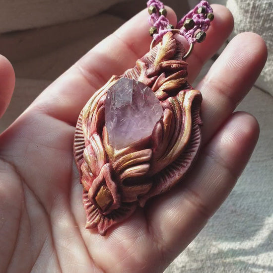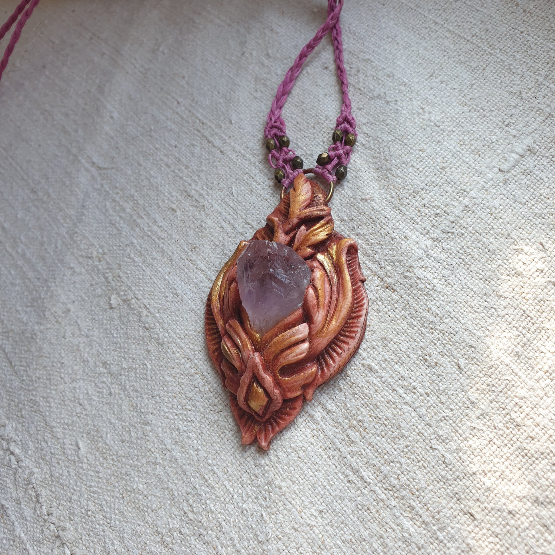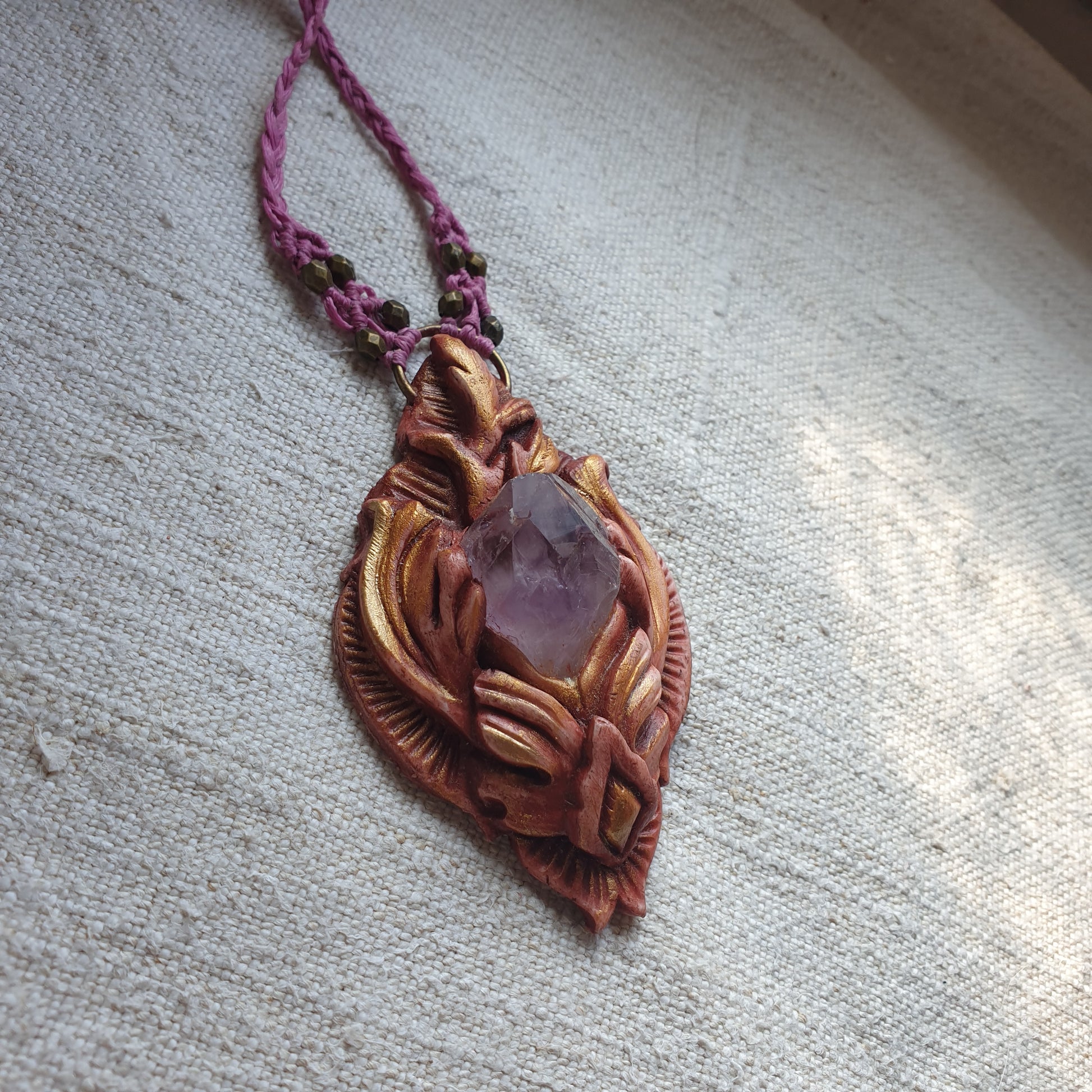 Unikatan nakit, izrađen od polimerske gline i ametista. Svaki komad je ručno modeliran, te postavljen na makrame ogrlicu od kvalitetnog voštanog konca. Jedinstven spoj prirodnih elemenata, ručne izrade i organske estetike.