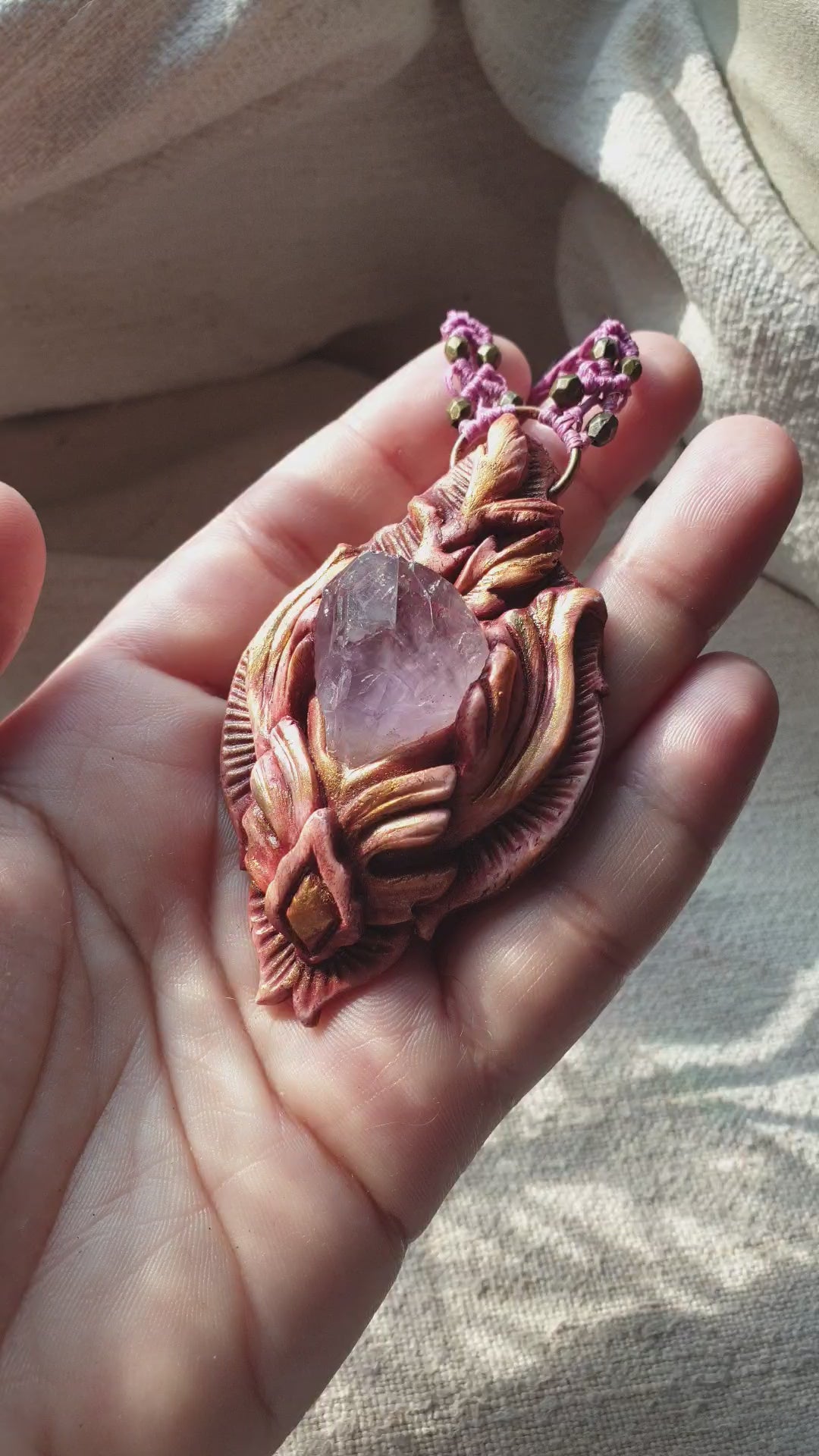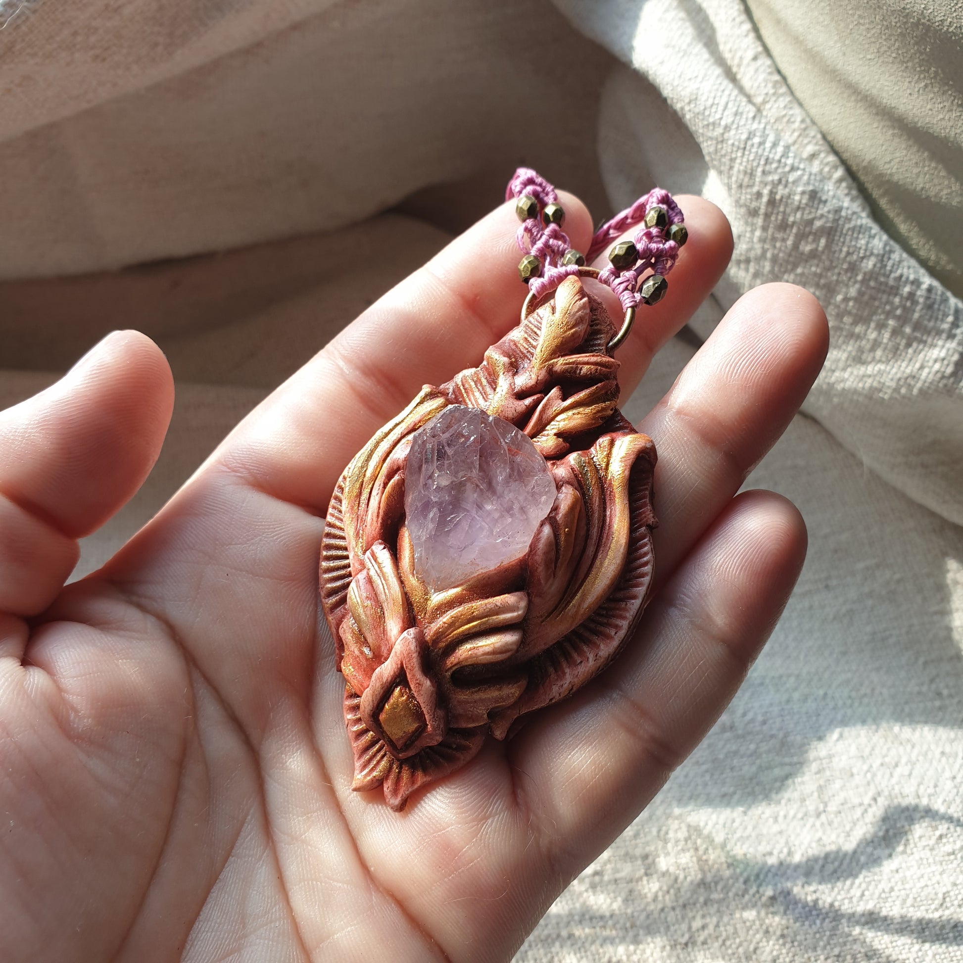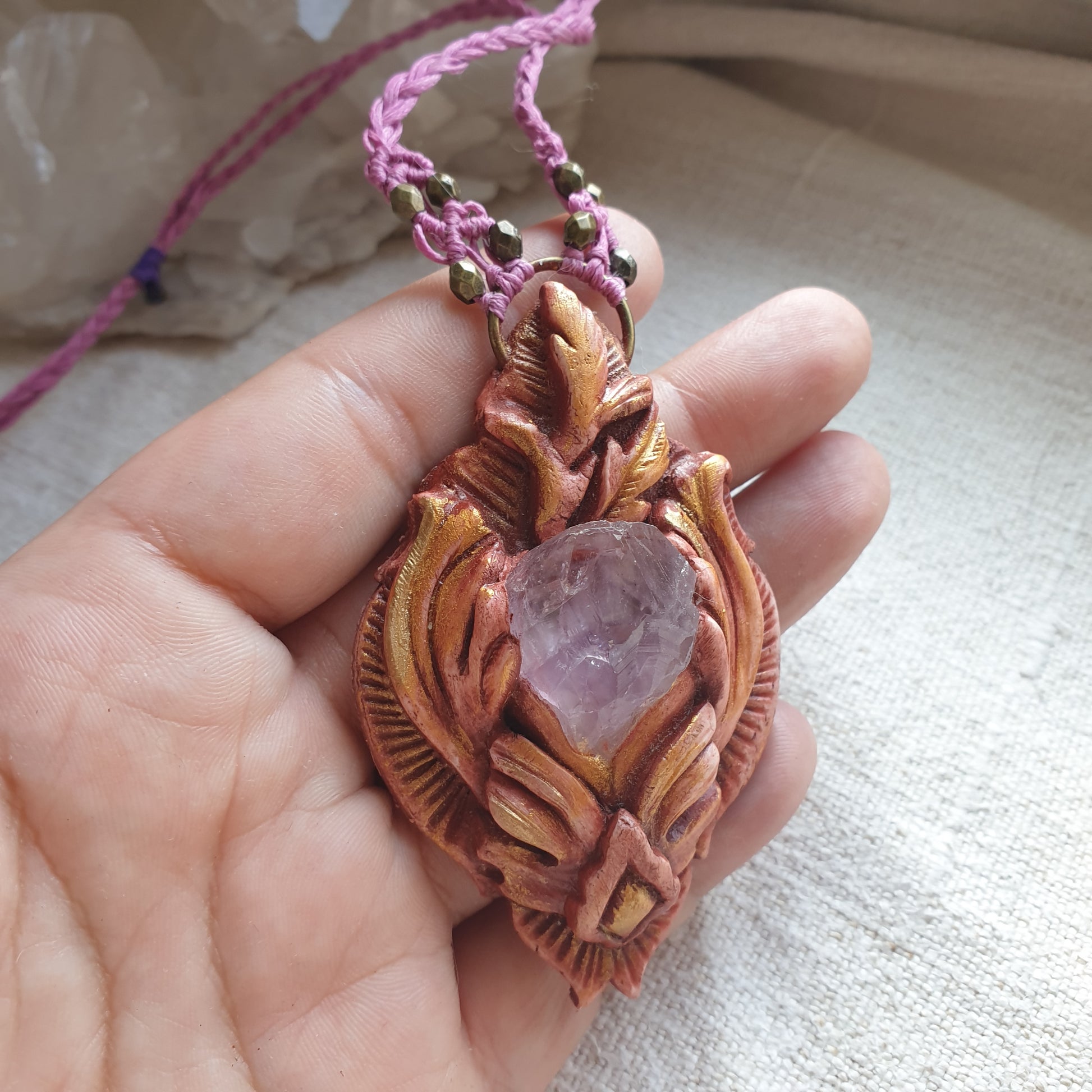 Unikatan nakit, izrađen od polimerske gline i ametista. Svaki komad je ručno modeliran, te postavljen na makrame ogrlicu od kvalitetnog voštanog konca. Jedinstven spoj prirodnih elemenata, ručne izrade i organske estetike.