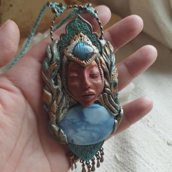 Unikatni ručno izrađeni privjesak od polimerske gline, peruanskog opala, labradorita, metalnih detalja i zaštitnog sloja epoxy smole, postavljen na ručno pletenu makrame ogrlicu. Svaki komad pažljivo je modeliran i oslikan, što ga čini potpuno jedinstvenim.