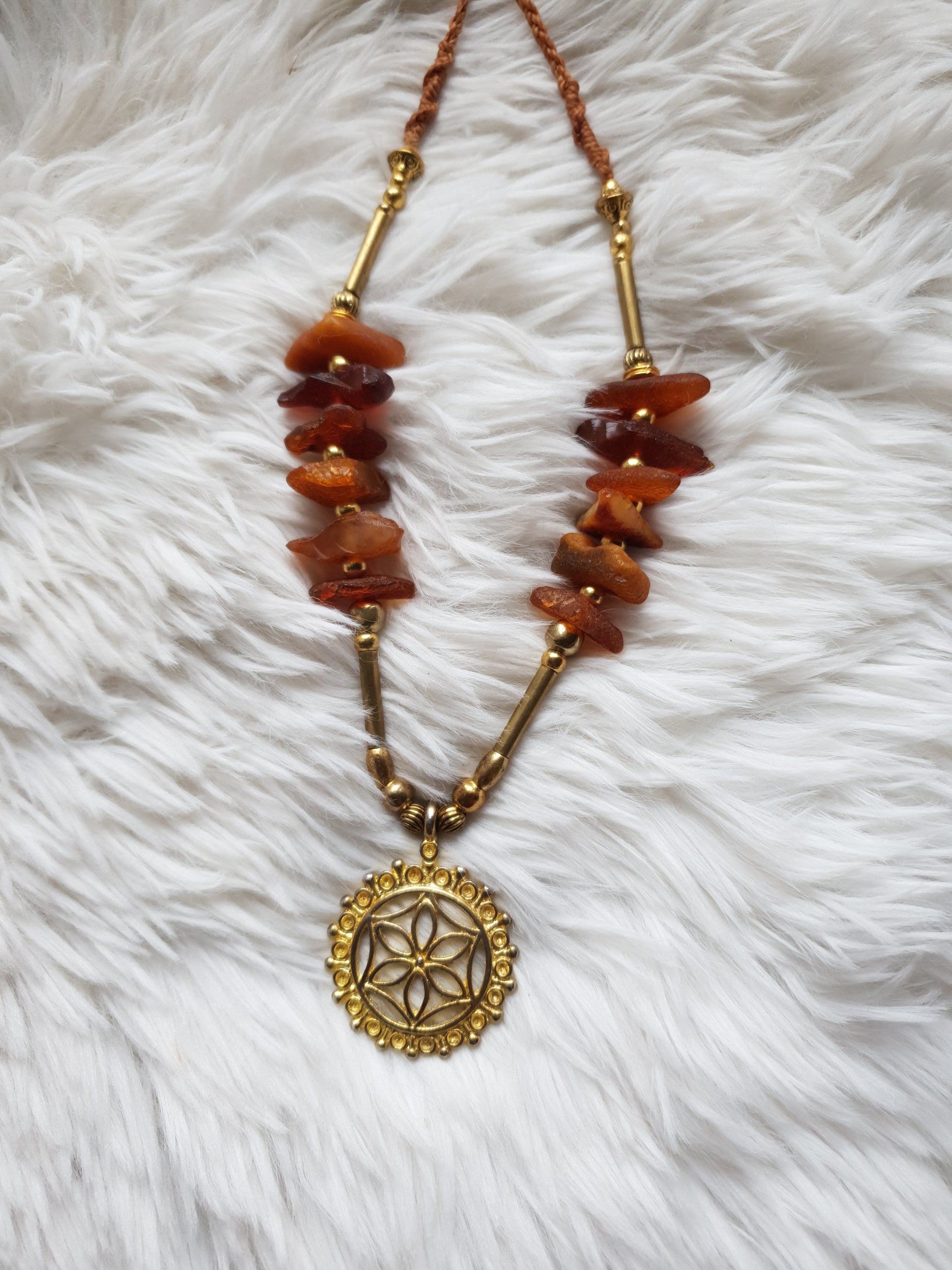 Ogrlica perunica, kombinacija kristalnih perlica, metalnih elemenata od mesinga i bakra te makrame voštanog konca. Svaki komad pažljivo je ručno složen i jedinstven u detaljima i boji.