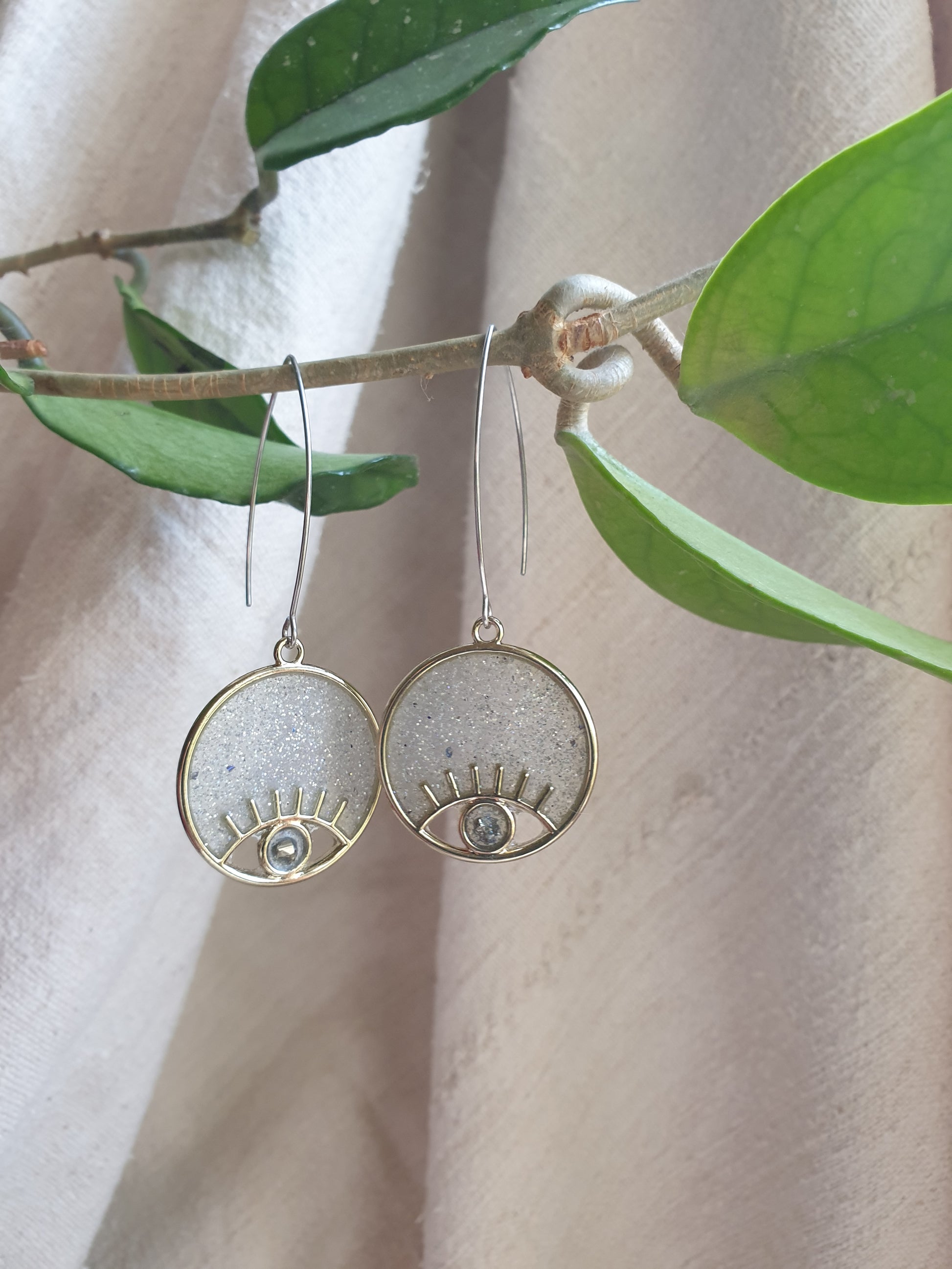 Ručno izrađene naušnice kombinirane od pomno odabranih elemenata, epoksi smole sa šljokicama i pirita. Lagane, udobne .