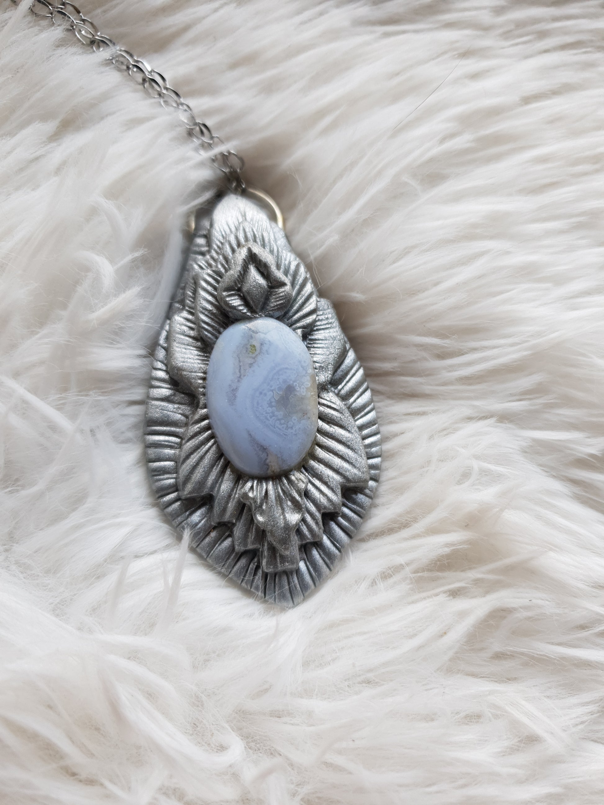 Unikatan ručno oblikovan privjesak od polimerske gline i plavog čipkastog ahata.
