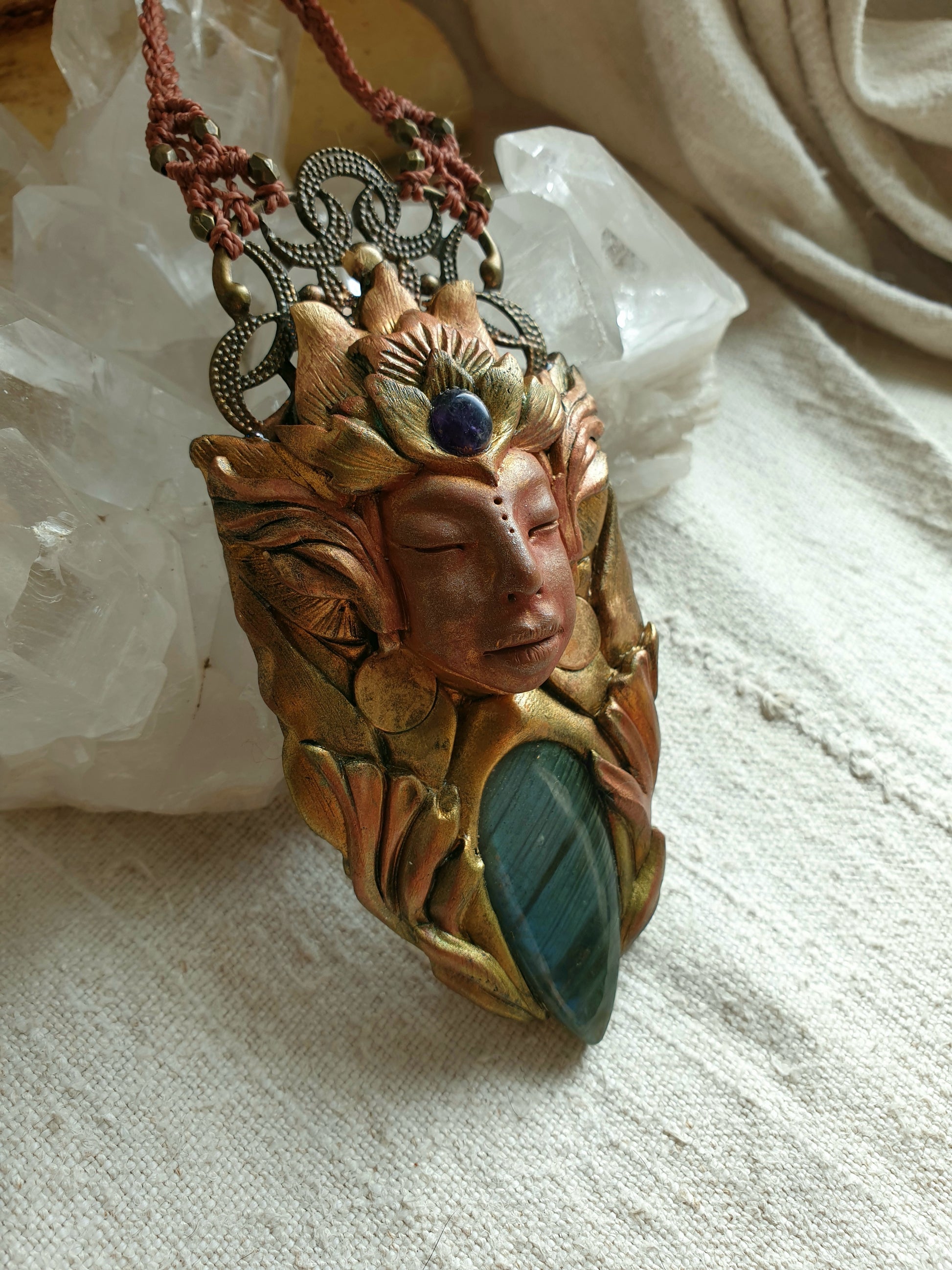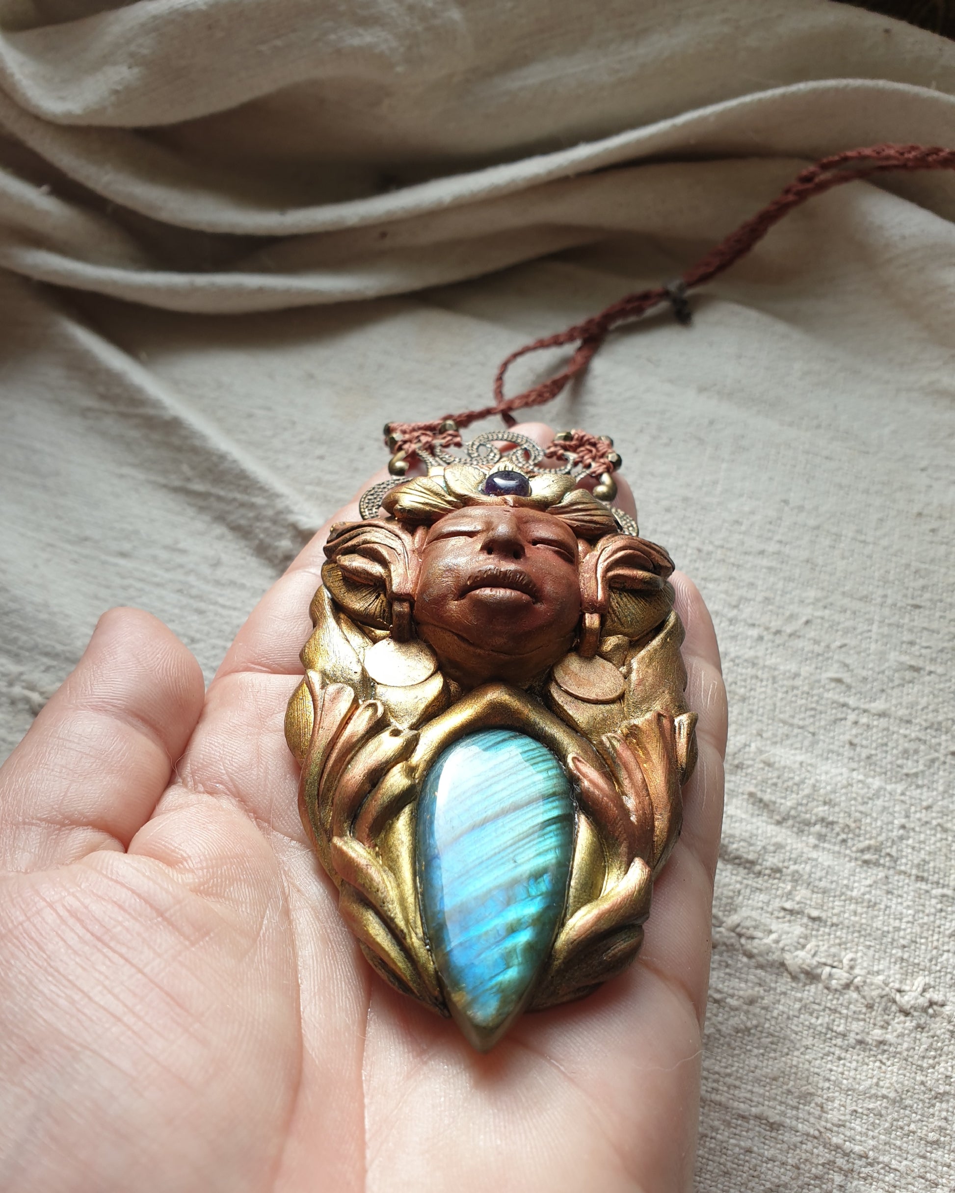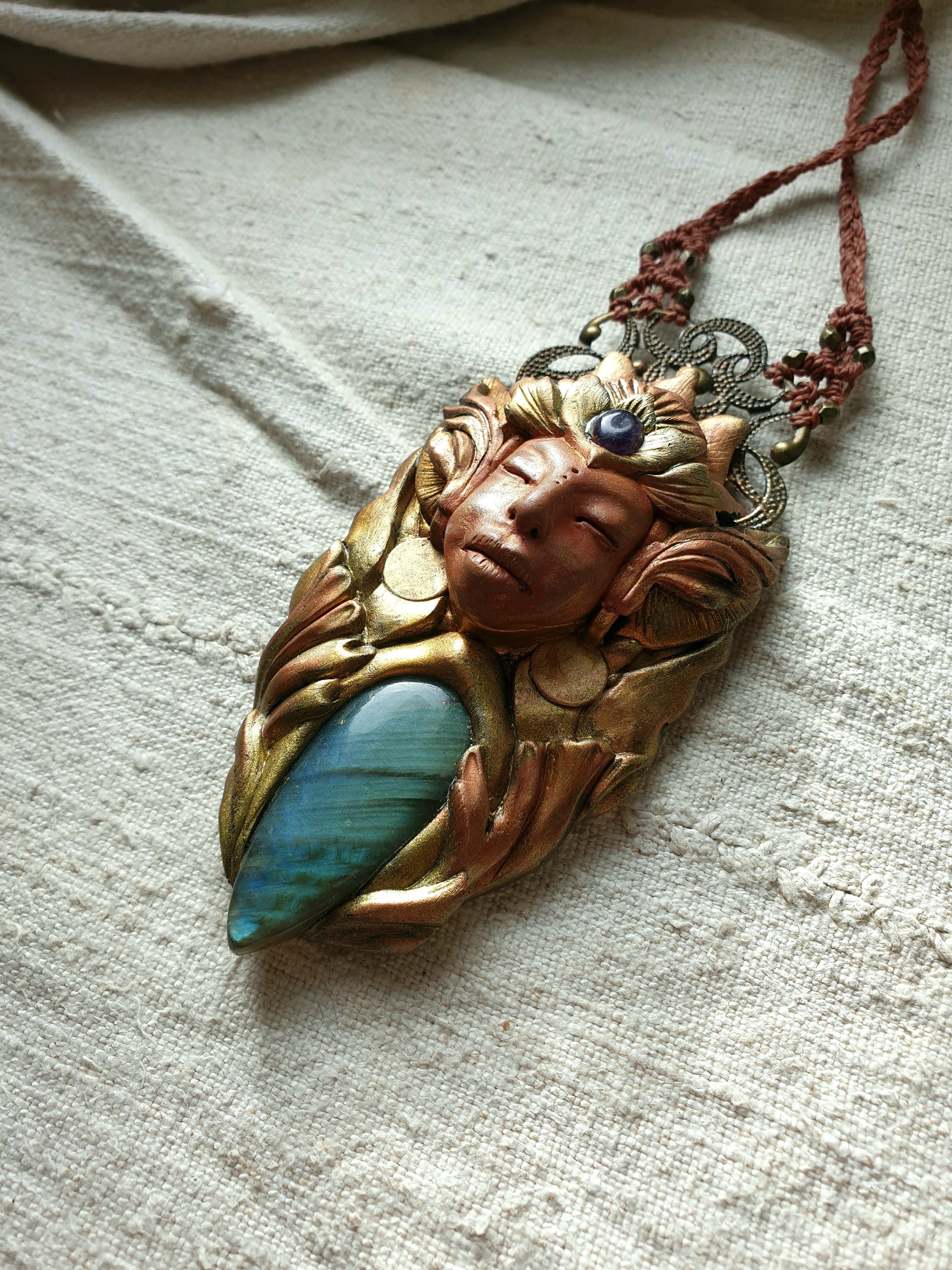 Unikatni ručno izrađeni privjesak od polimerske gline, plavog labradorita, ametista, metalnih detalja i zaštitnog sloja epoxy smole, postavljen na ručno pletenu makrame ogrlicu. Svaki komad pažljivo je modeliran i oslikan, što ga čini potpuno jedinstvenim.