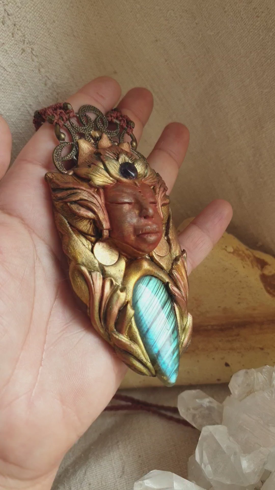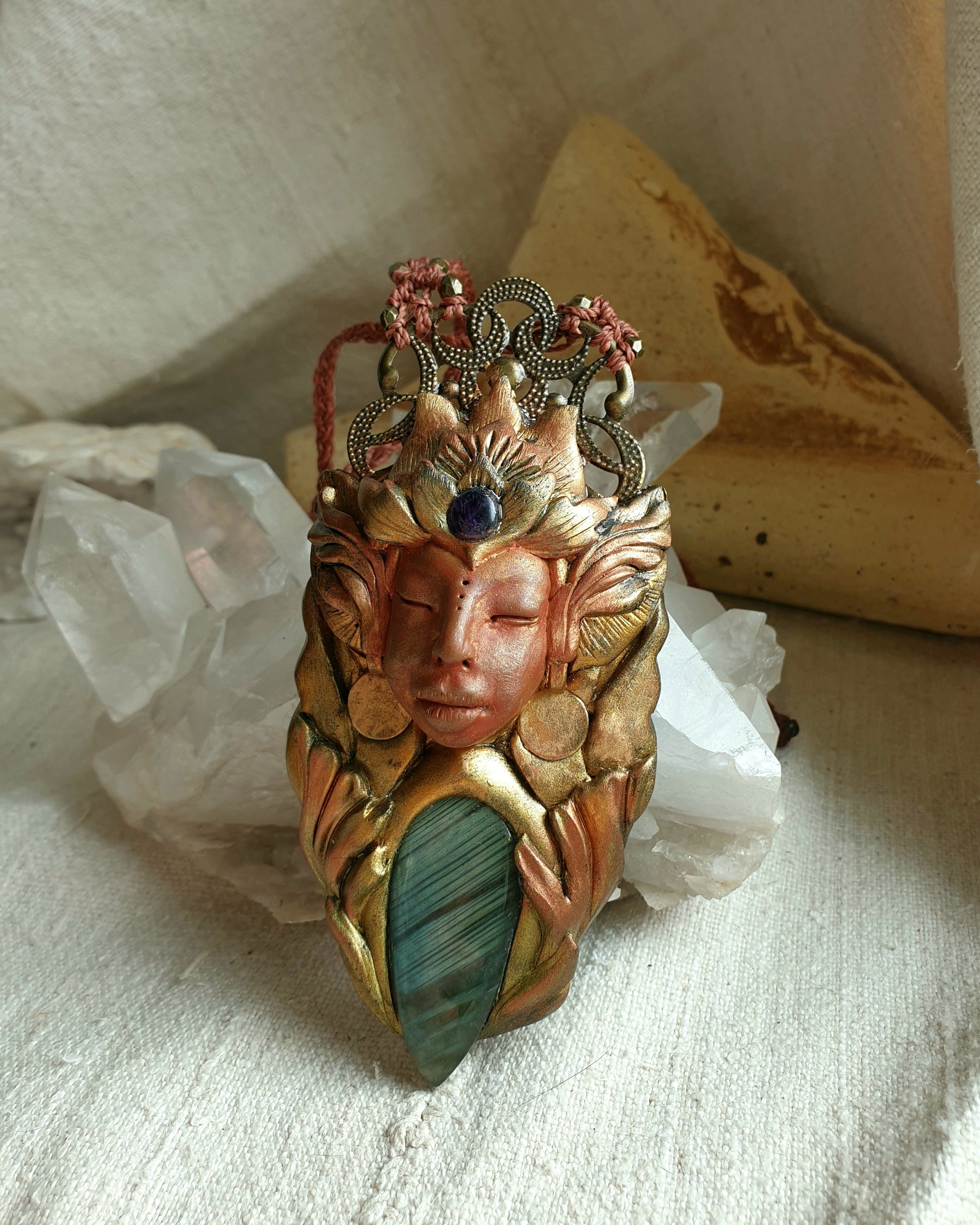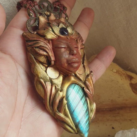 Unikatni ručno izrađeni privjesak od polimerske gline, plavog labradorita, ametista, metalnih detalja i zaštitnog sloja epoxy smole, postavljen na ručno pletenu makrame ogrlicu. Svaki komad pažljivo je modeliran i oslikan, što ga čini potpuno jedinstvenim.