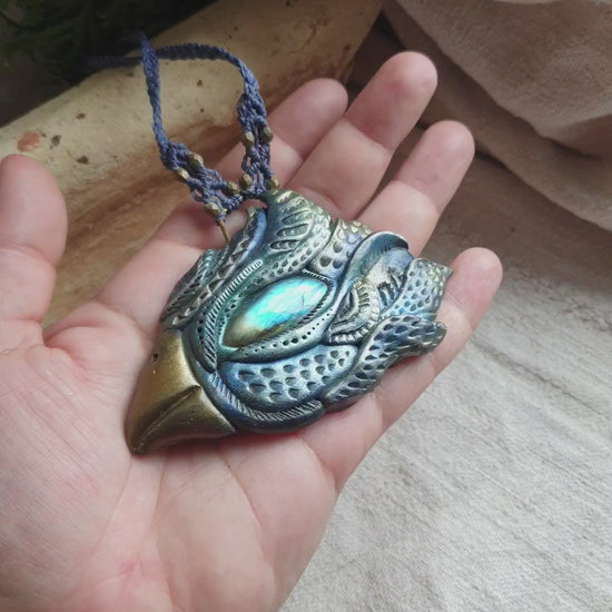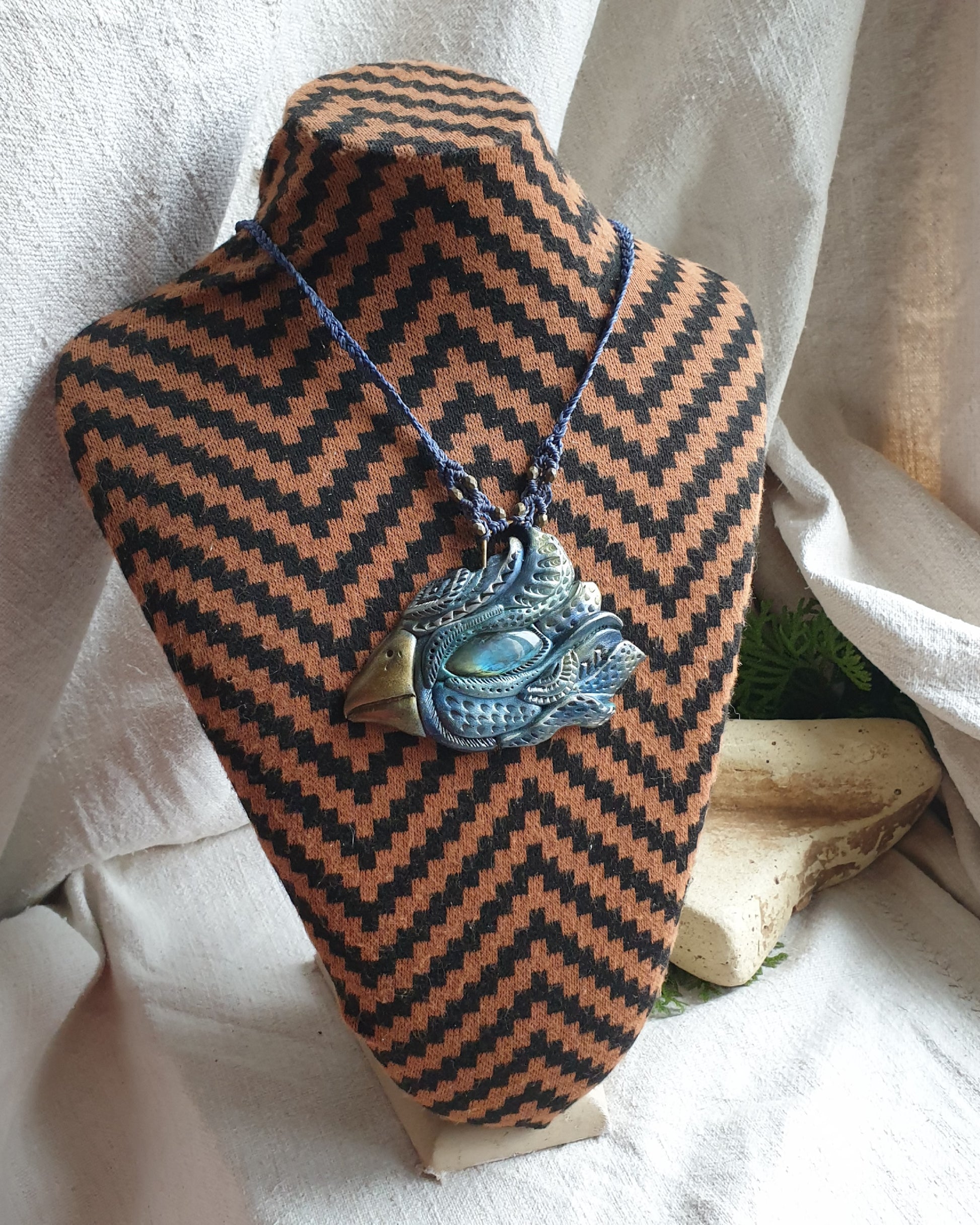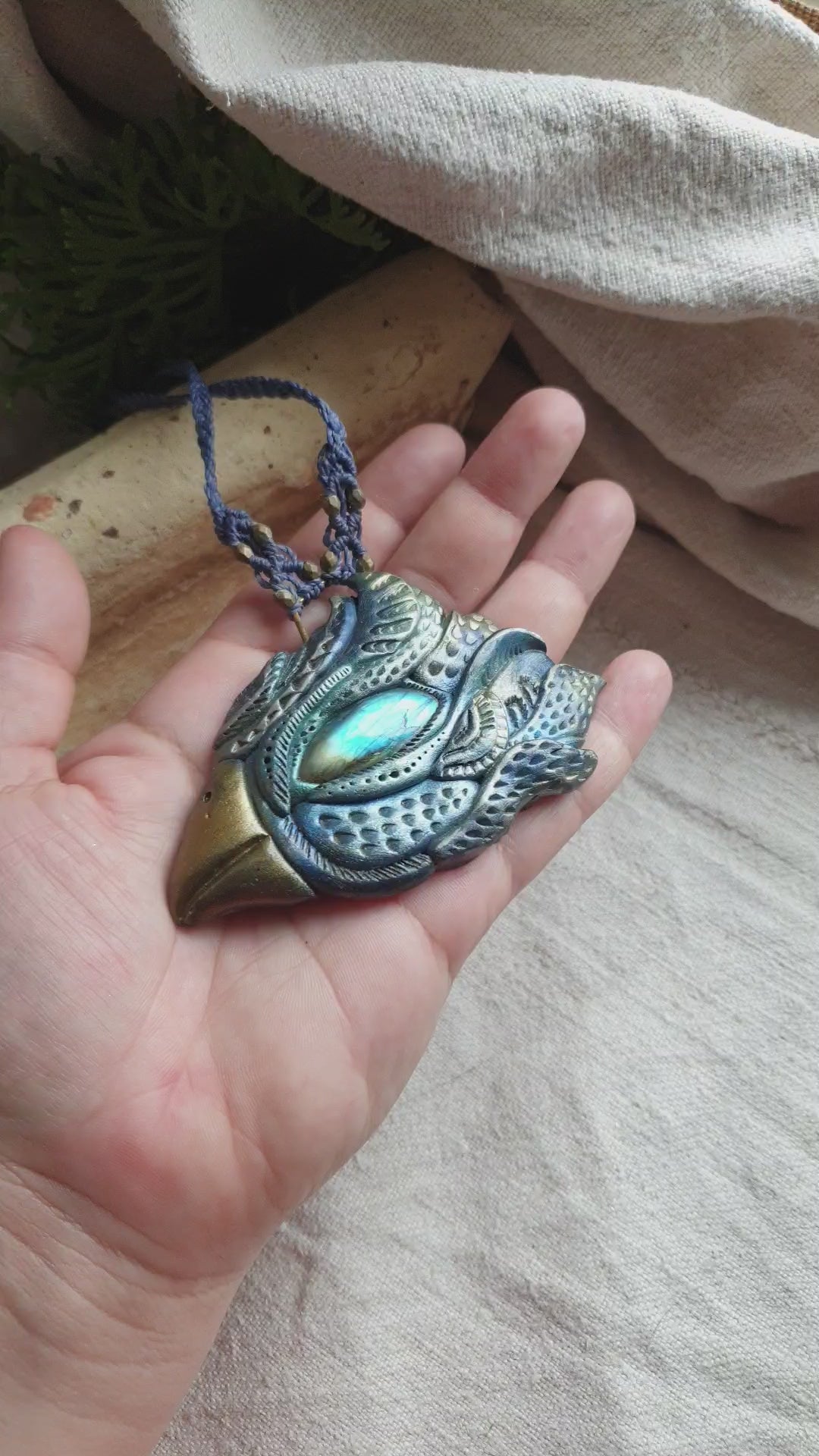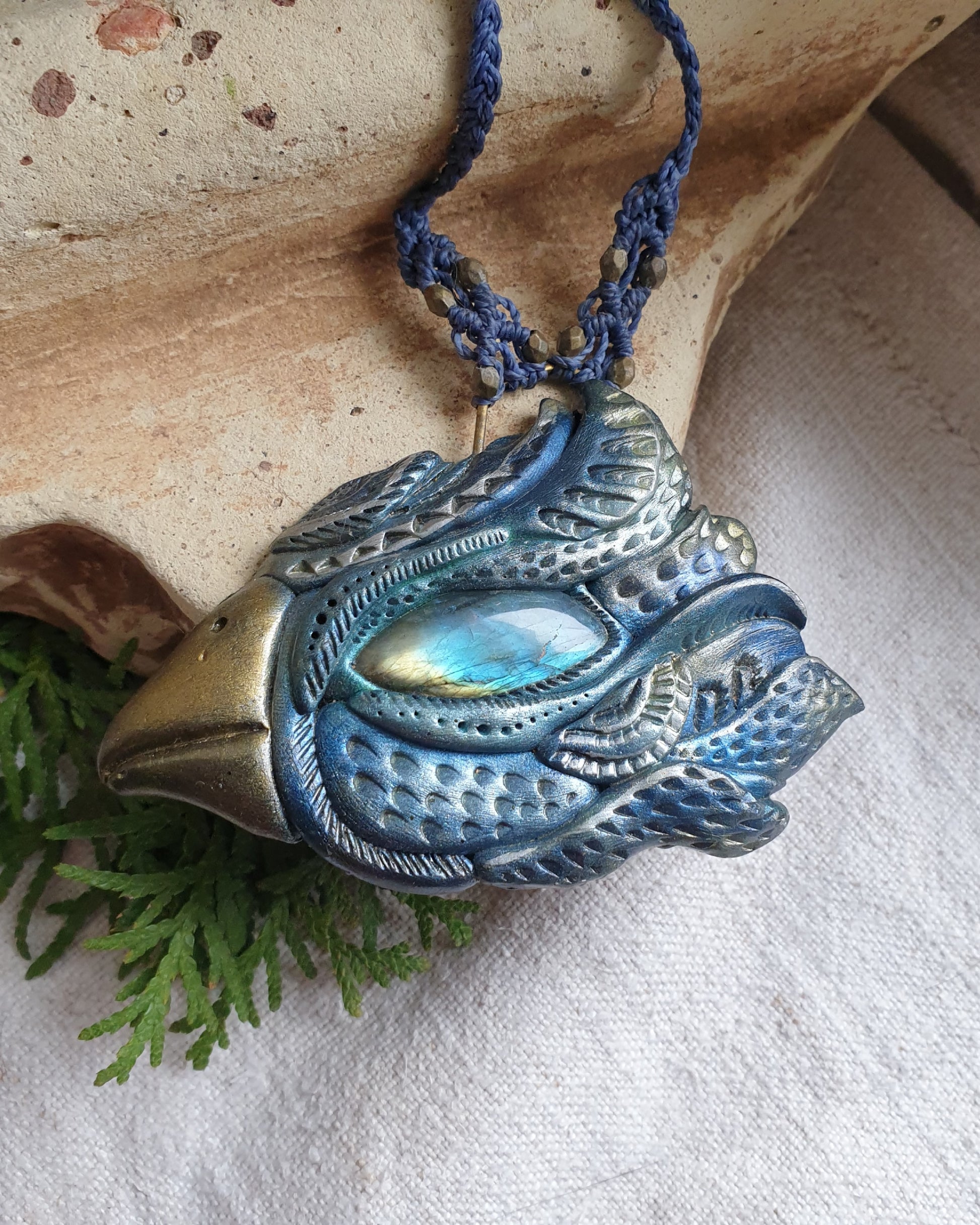 Unikatni ručno izrađeni privjesak od polimerske gline i plavog labradorita, zaštitnog sloja epoxy smole, postavljen na ručno pletenu makrame ogrlicu. Svaki komad pažljivo je modeliran i oslikan, što ga čini potpuno jedinstvenim.