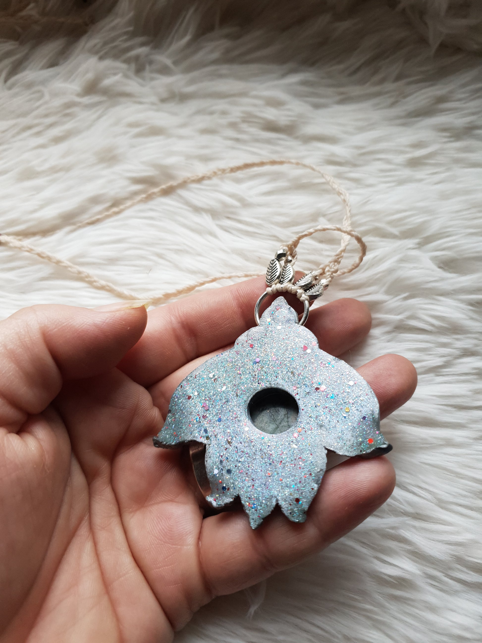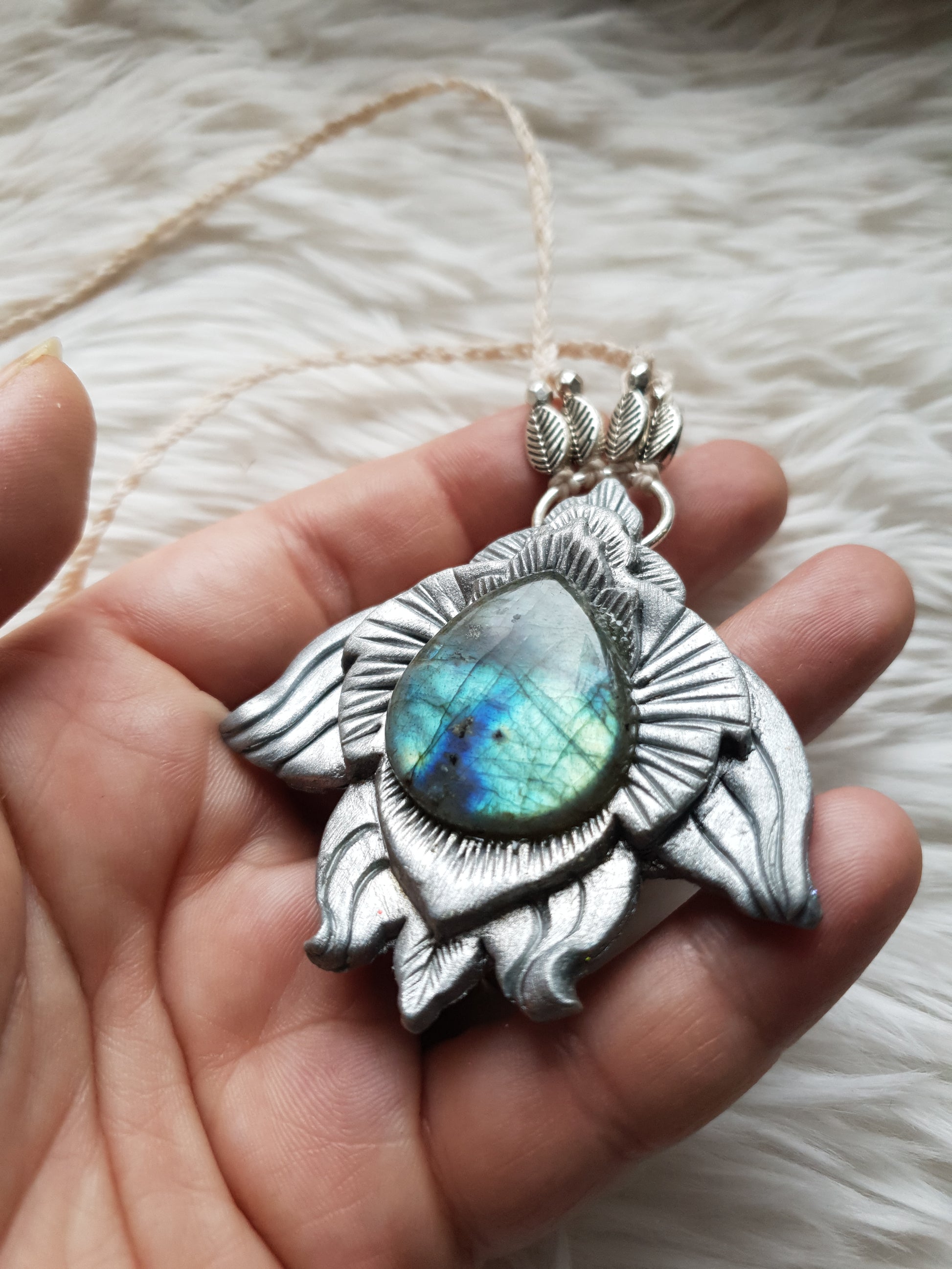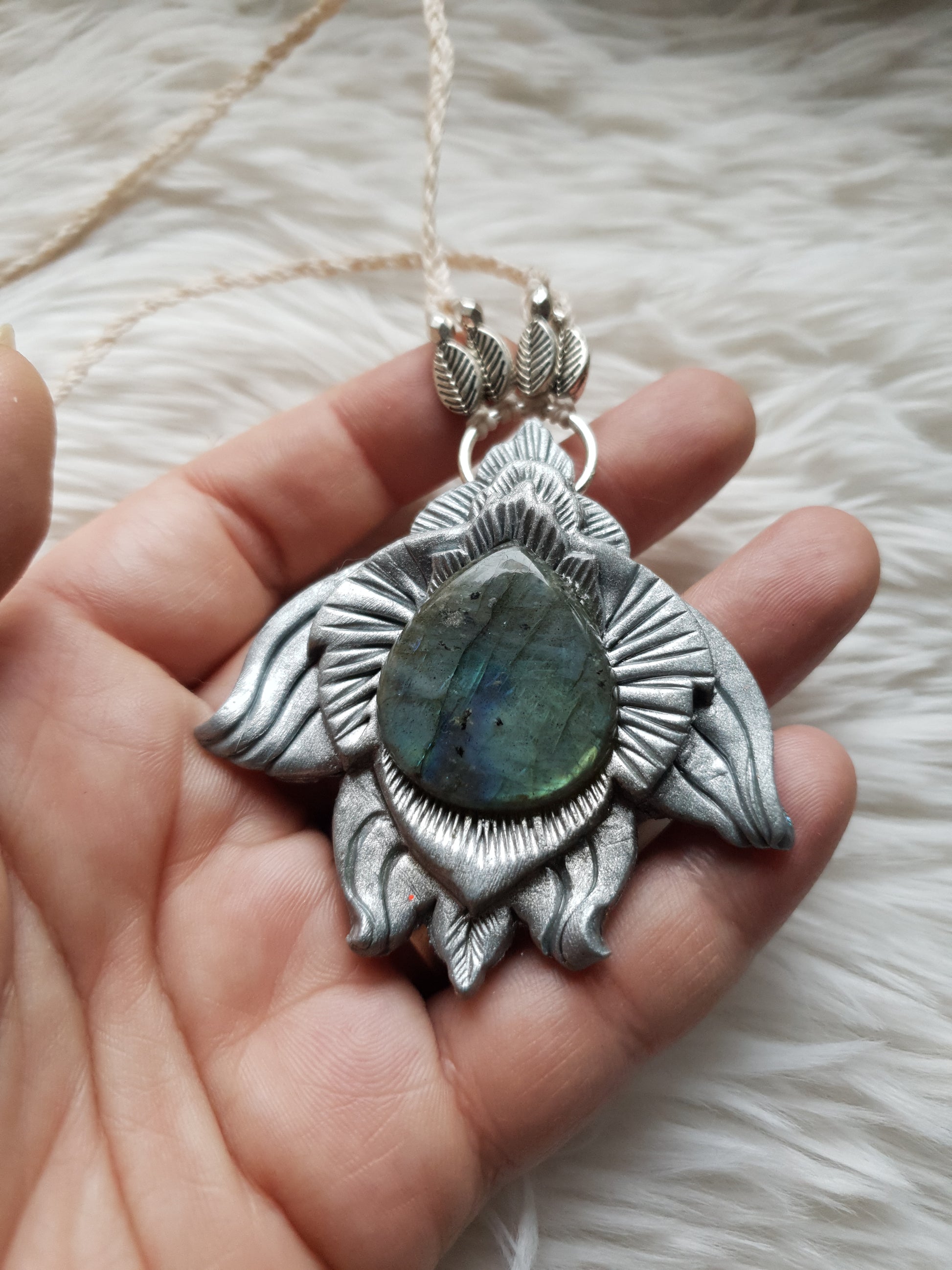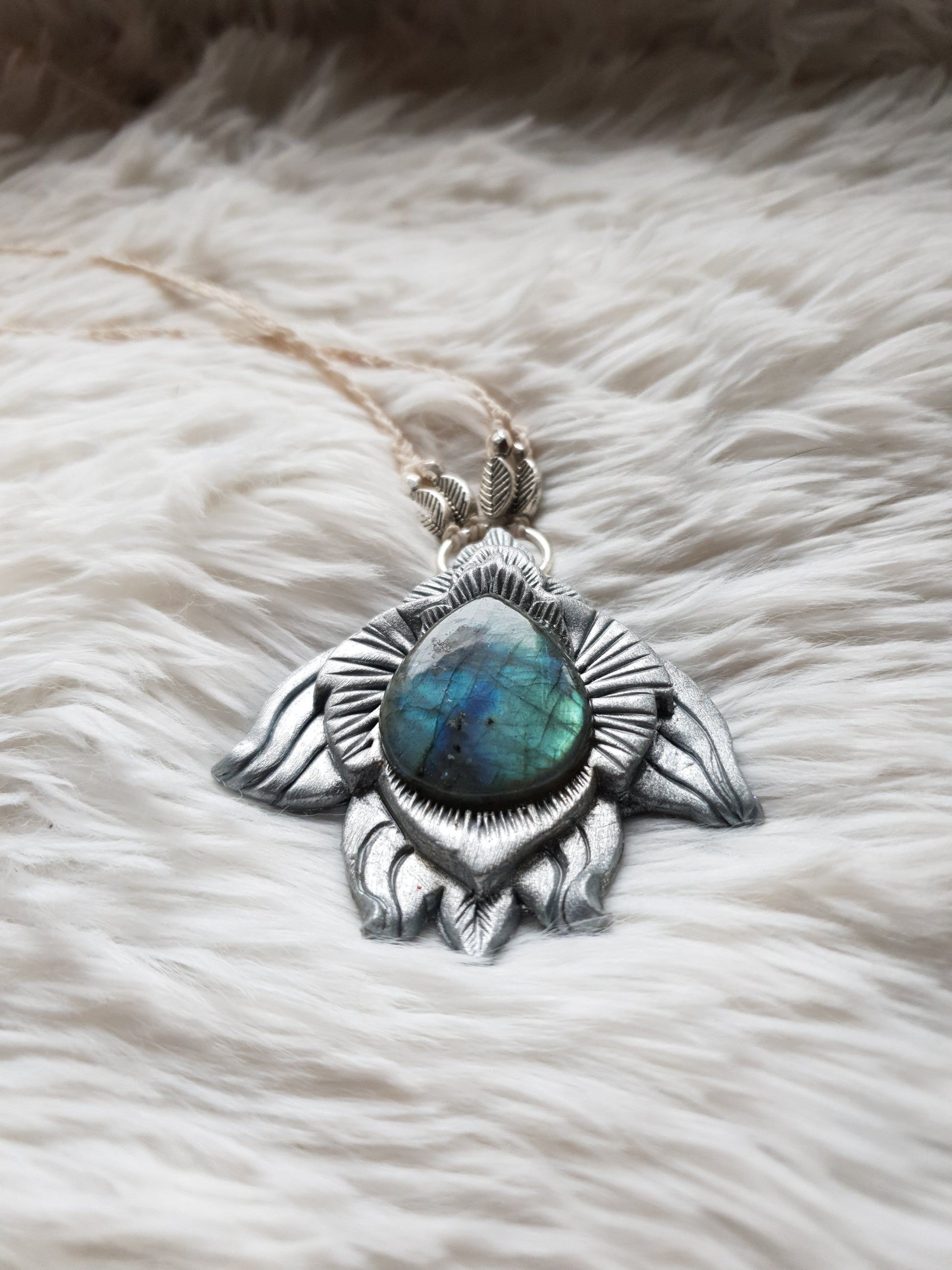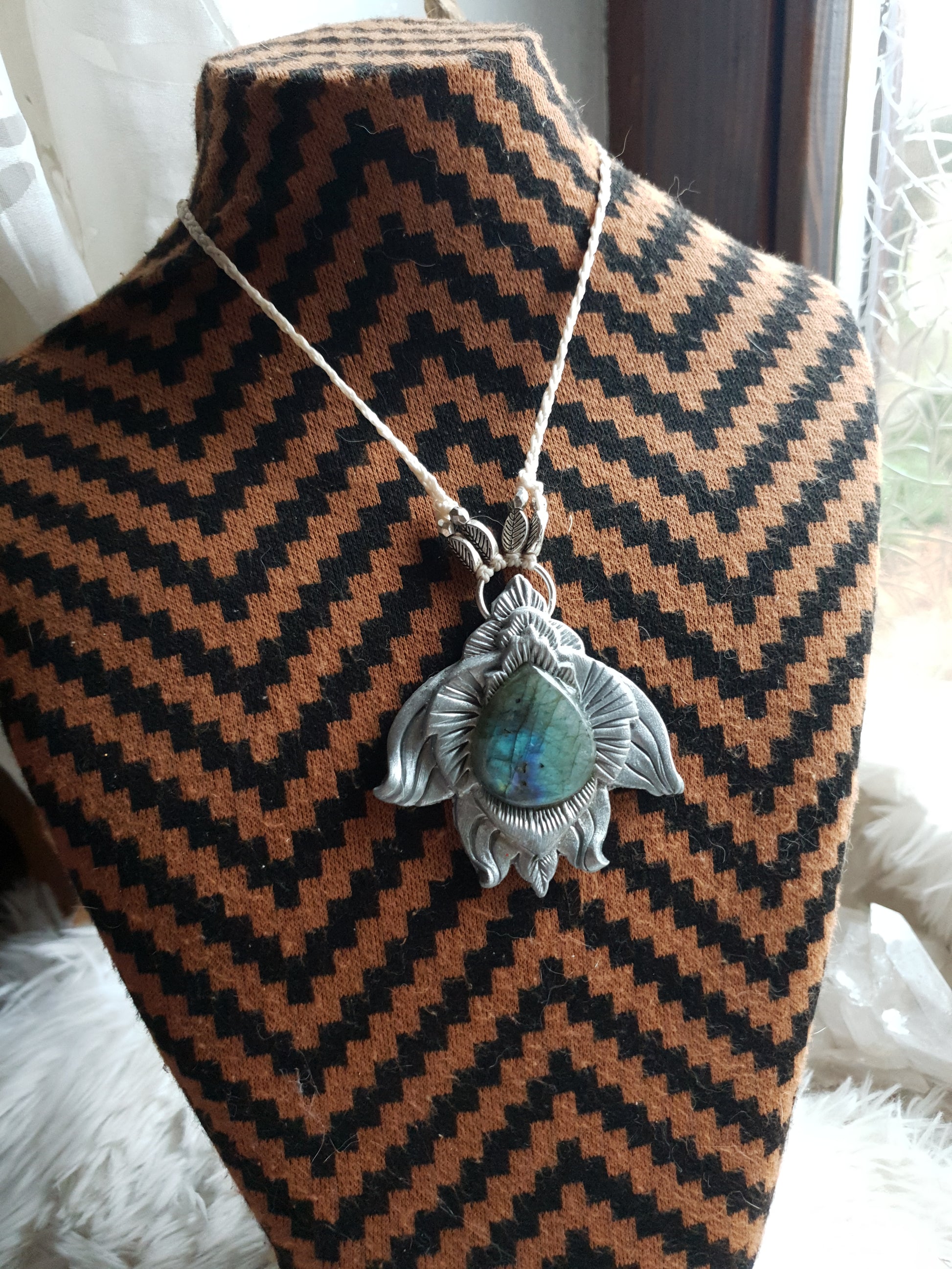 Unikatan nakit, izrađen od polimerske gline i labradorita. Svaki komad je ručno modeliran, te postavljen na makrame ogrlicu od kvalitetnog voštanog konca. Jedinstven spoj prirodnih elemenata, ručne izrade i organske estetike.
