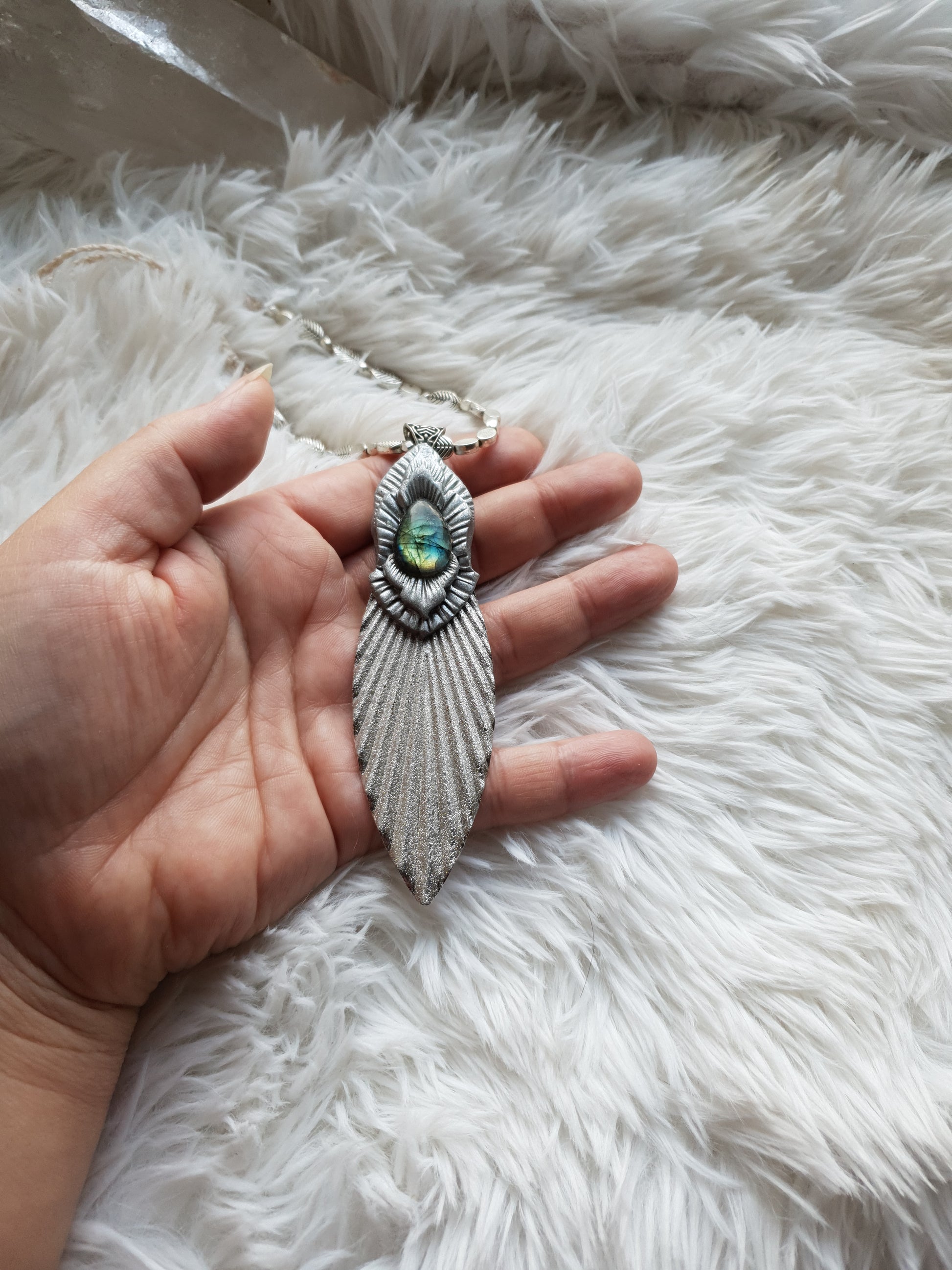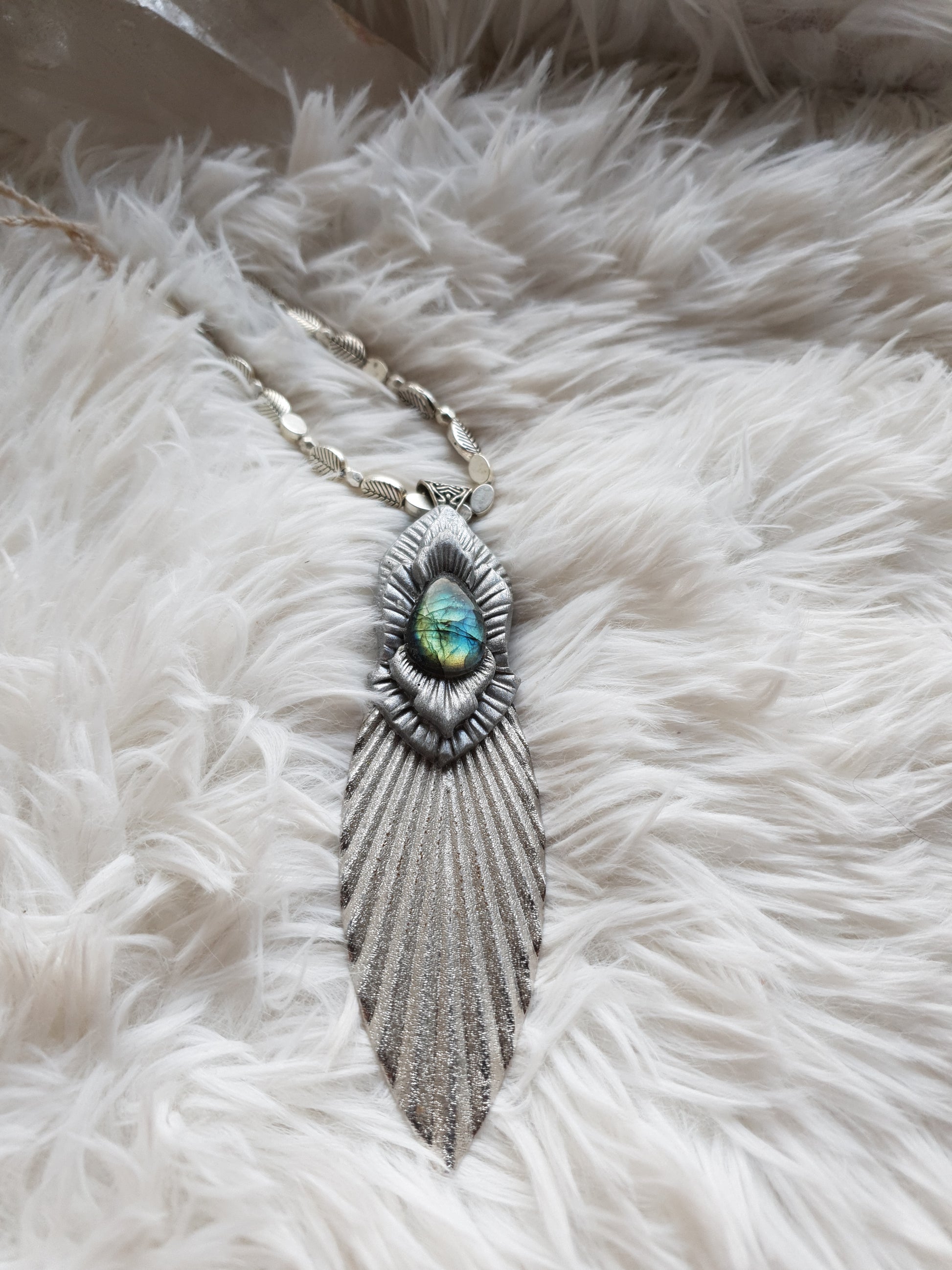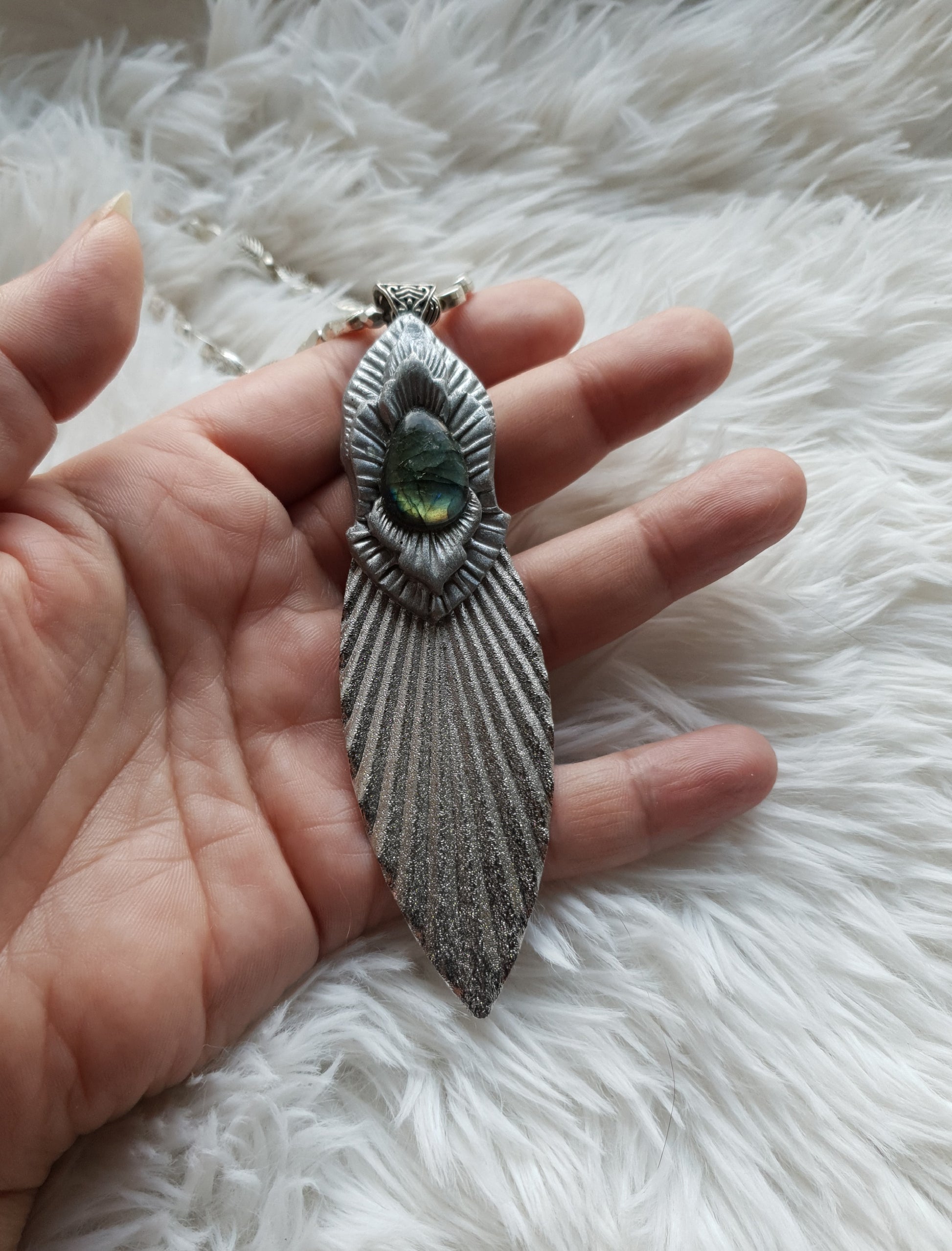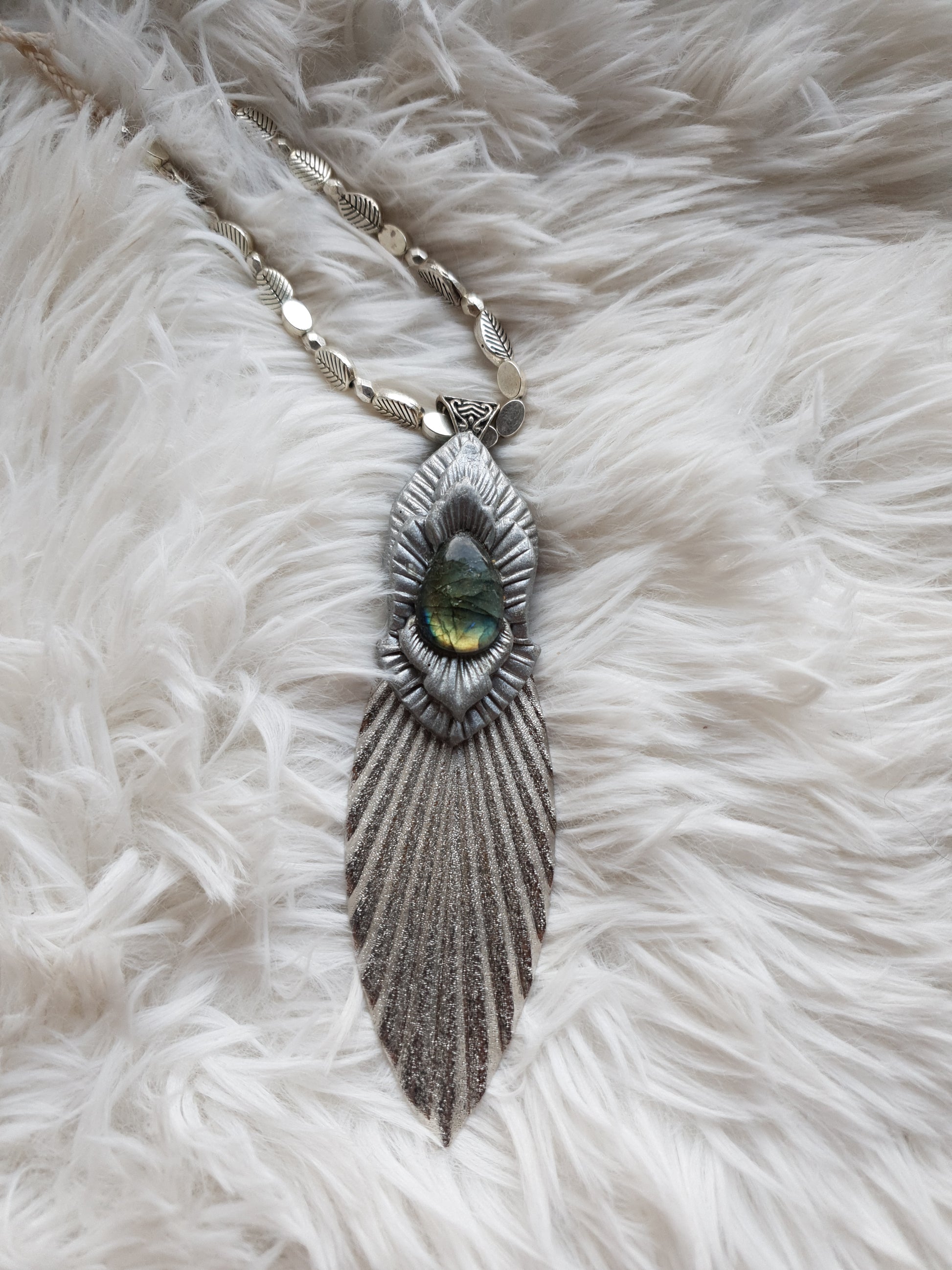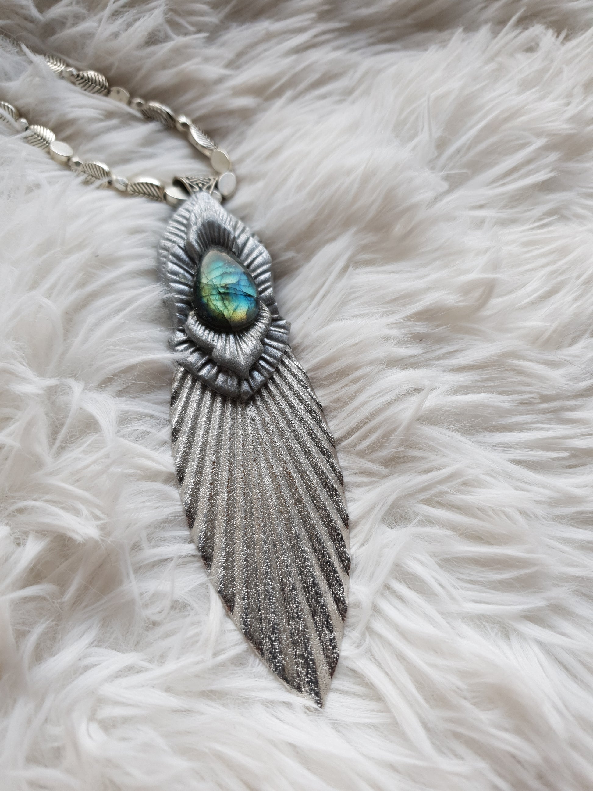 Unikatan ručno oblikovan privjesak od polimerske gline i plavo zelenog labradorita.