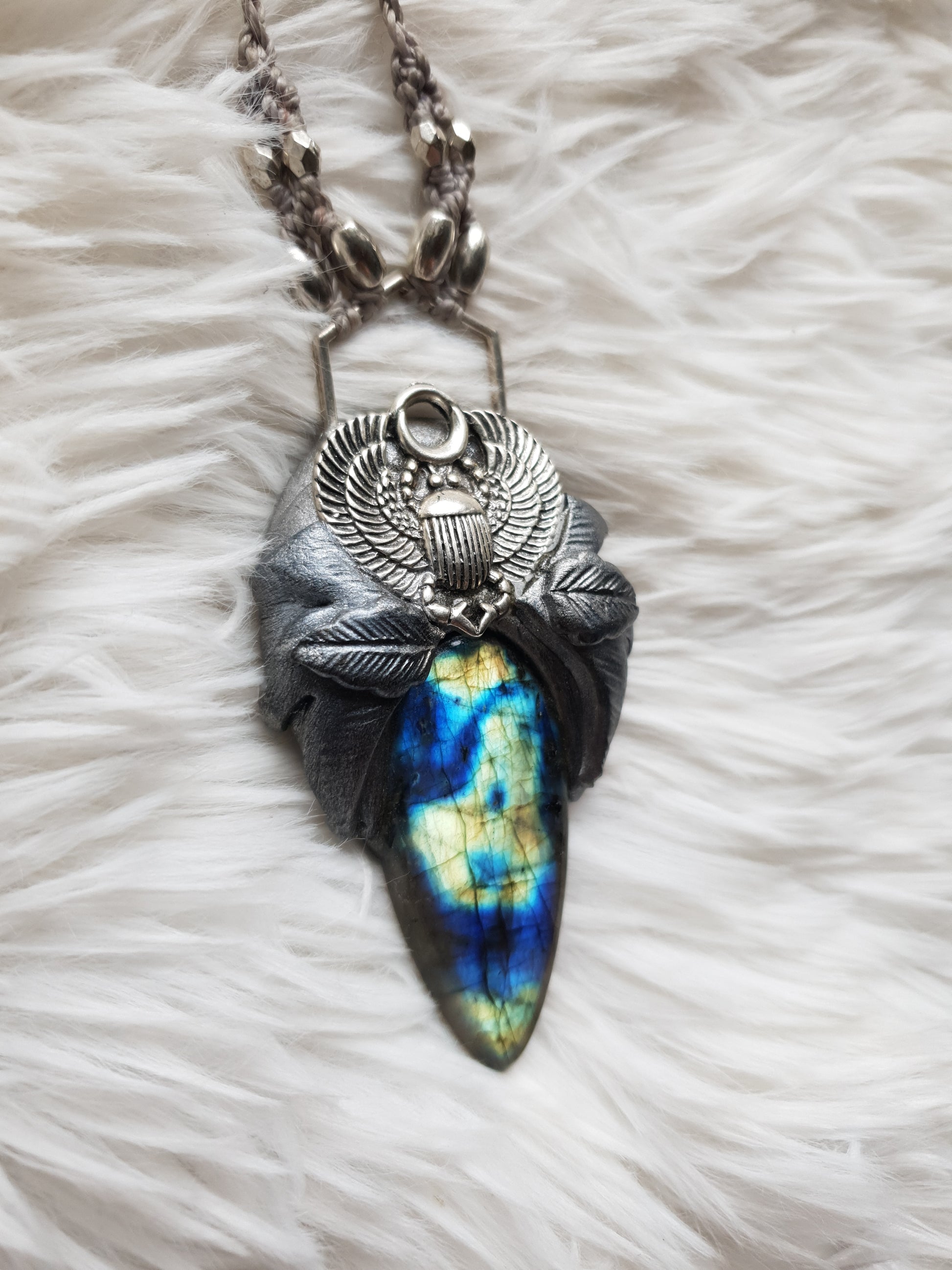 Unikatan nakit, izrađen od polimerske gline i plavo zelenog labradorita. Svaki komad je ručno modeliran, te postavljen na makrame ogrlicu od kvalitetnog voštanog konca. Jedinstven spoj prirodnih elemenata, ručne izrade i organske estetike.