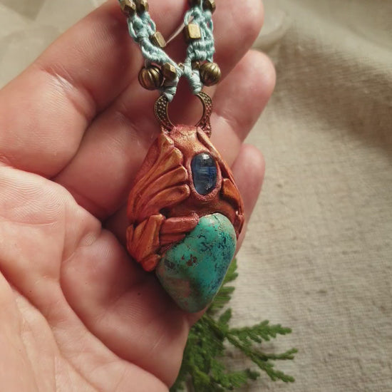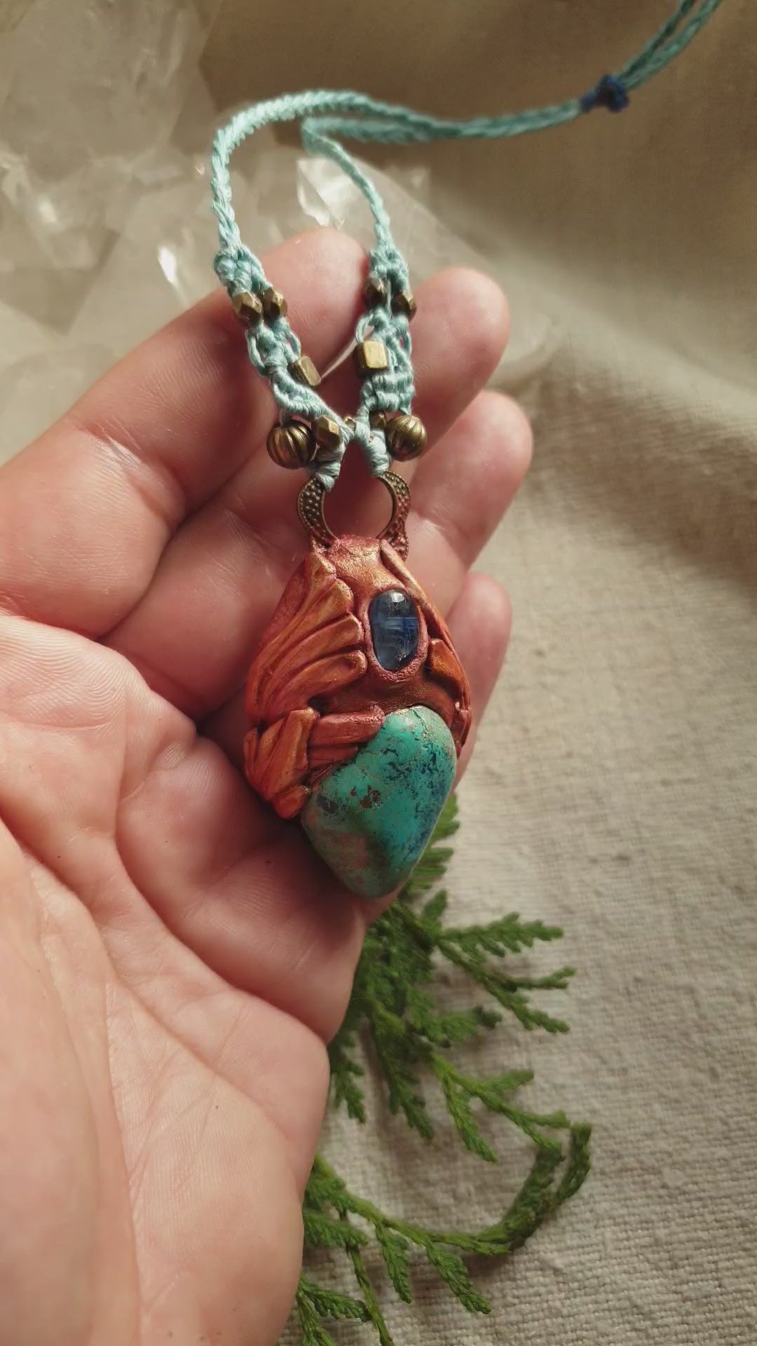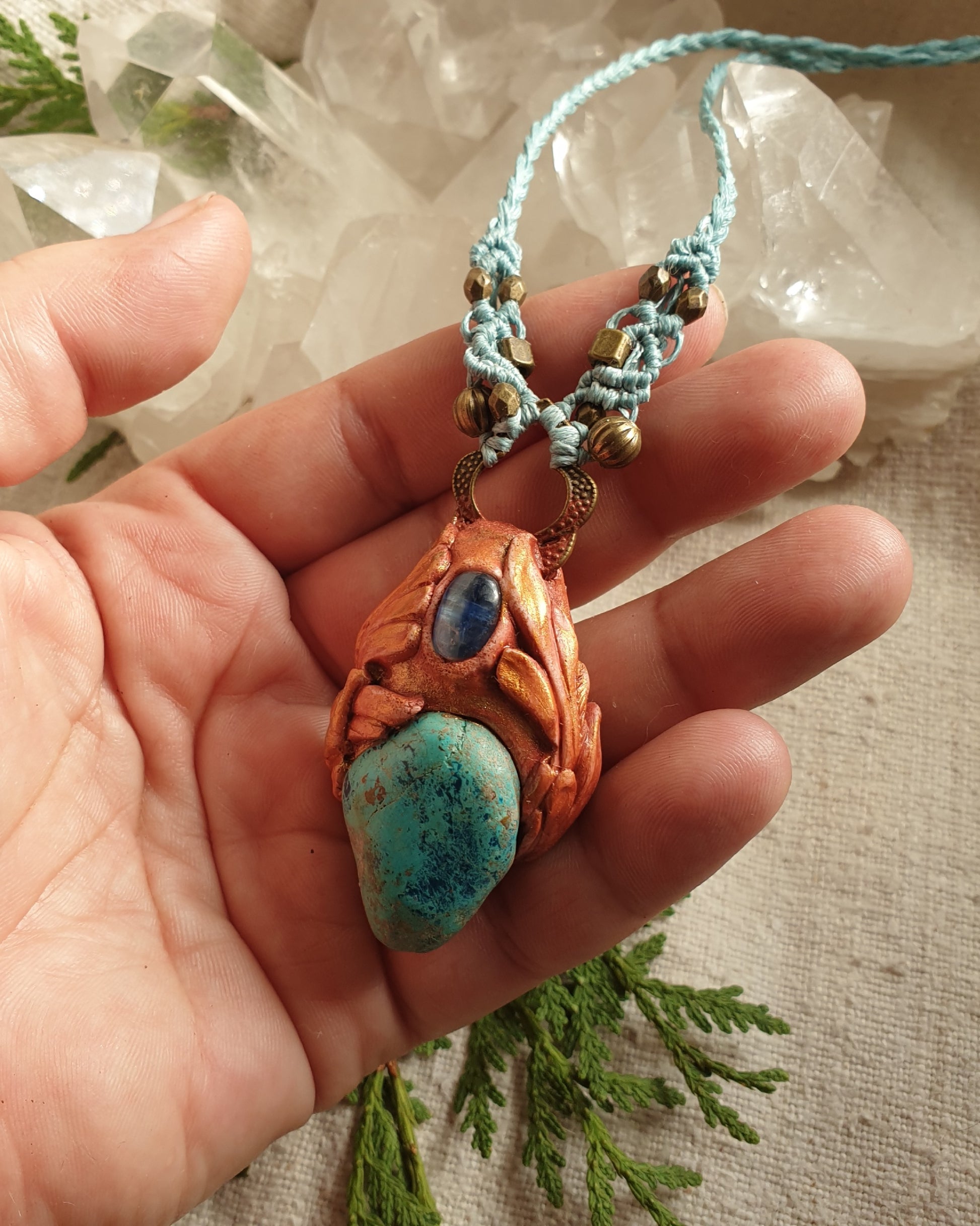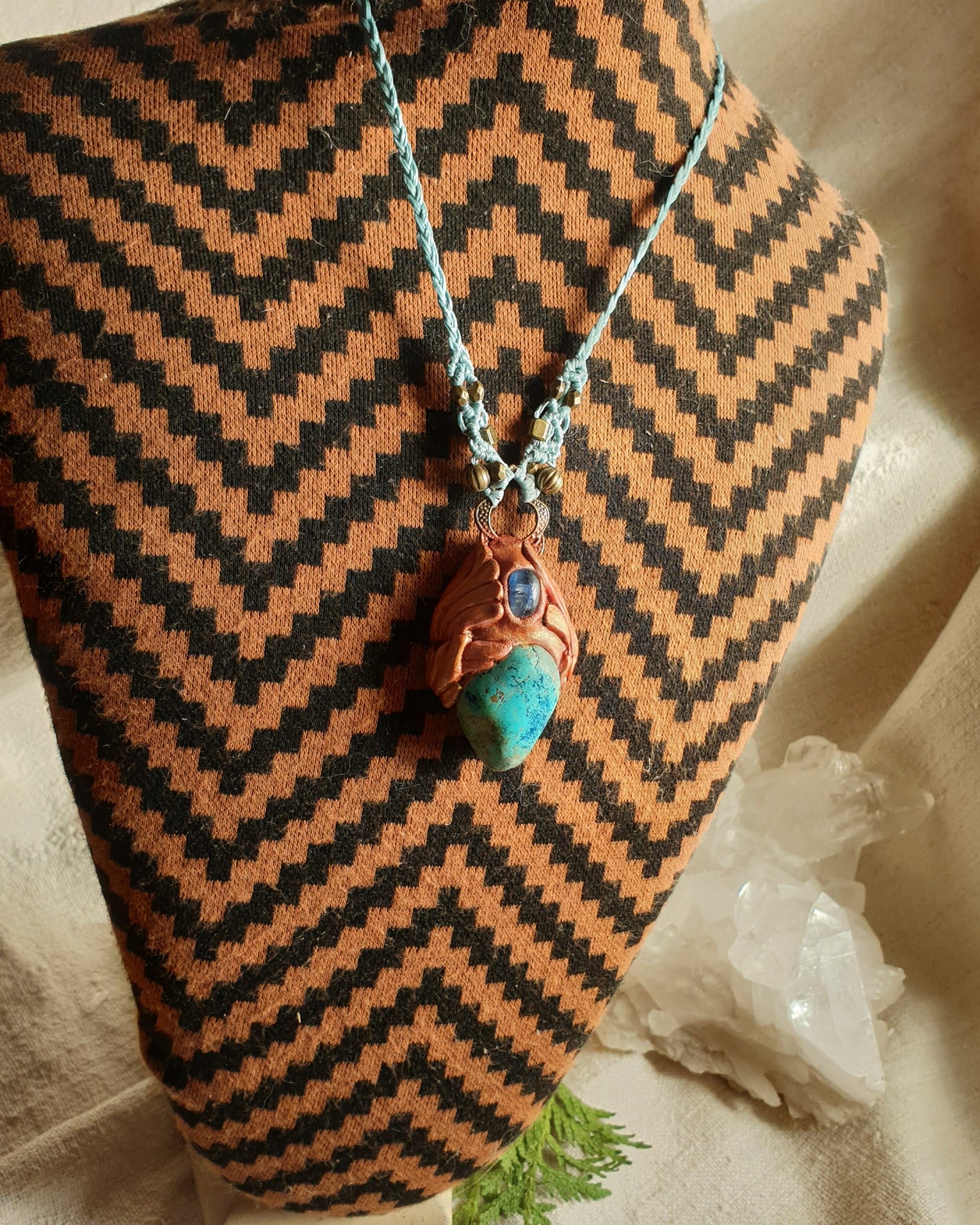 Unikatan nakit, izrađen od polimerske gline kijanita i šatukita . Svaki komad je ručno modeliran, te postavljen na makrame ogrlicu od kvalitetnog voštanog konca. Jedinstven spoj prirodnih elemenata, ručne izrade i organske estetike.
