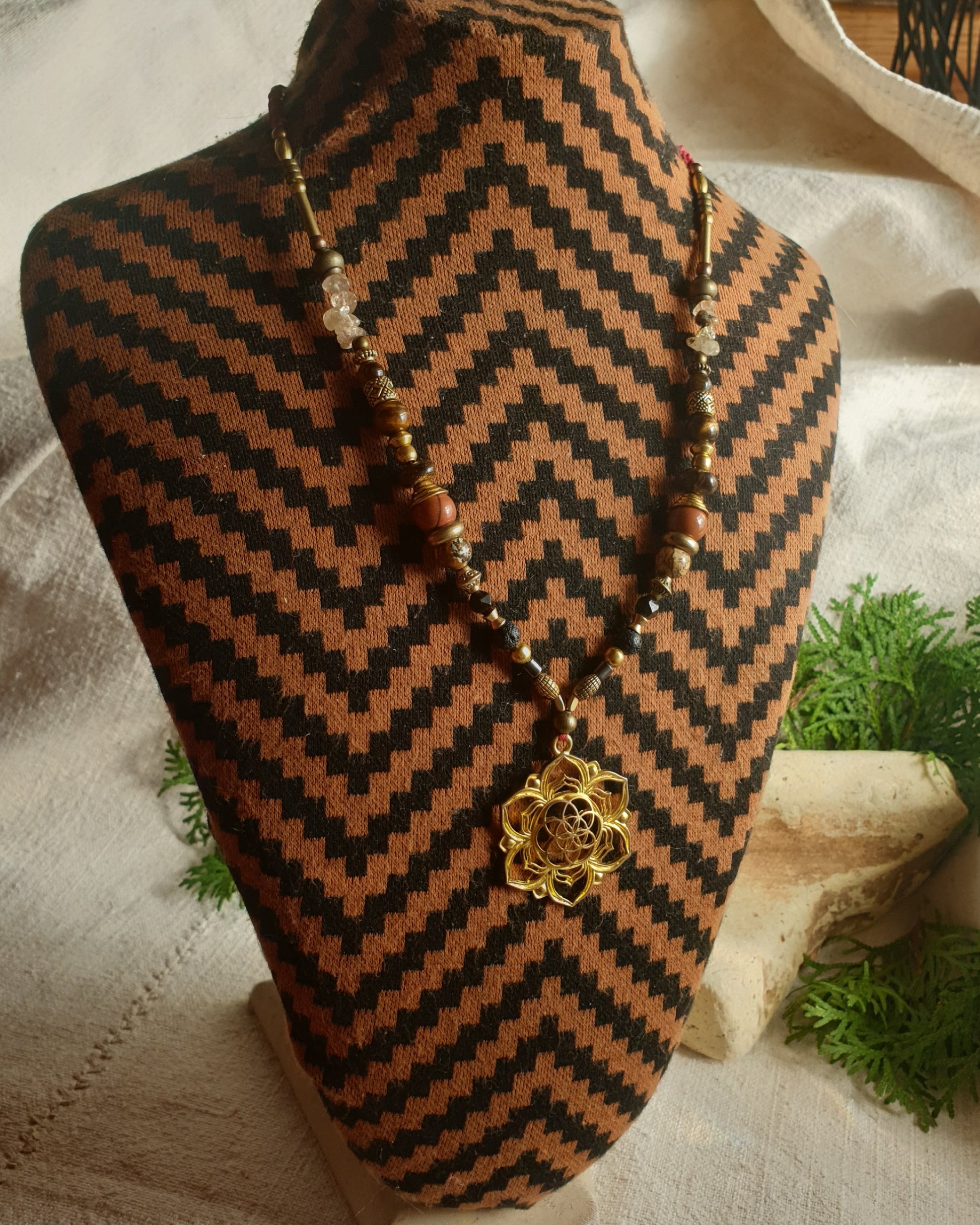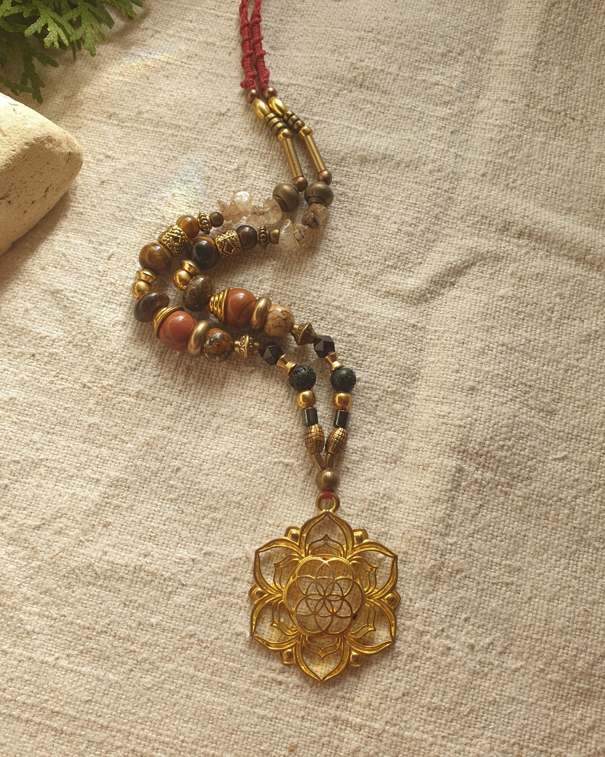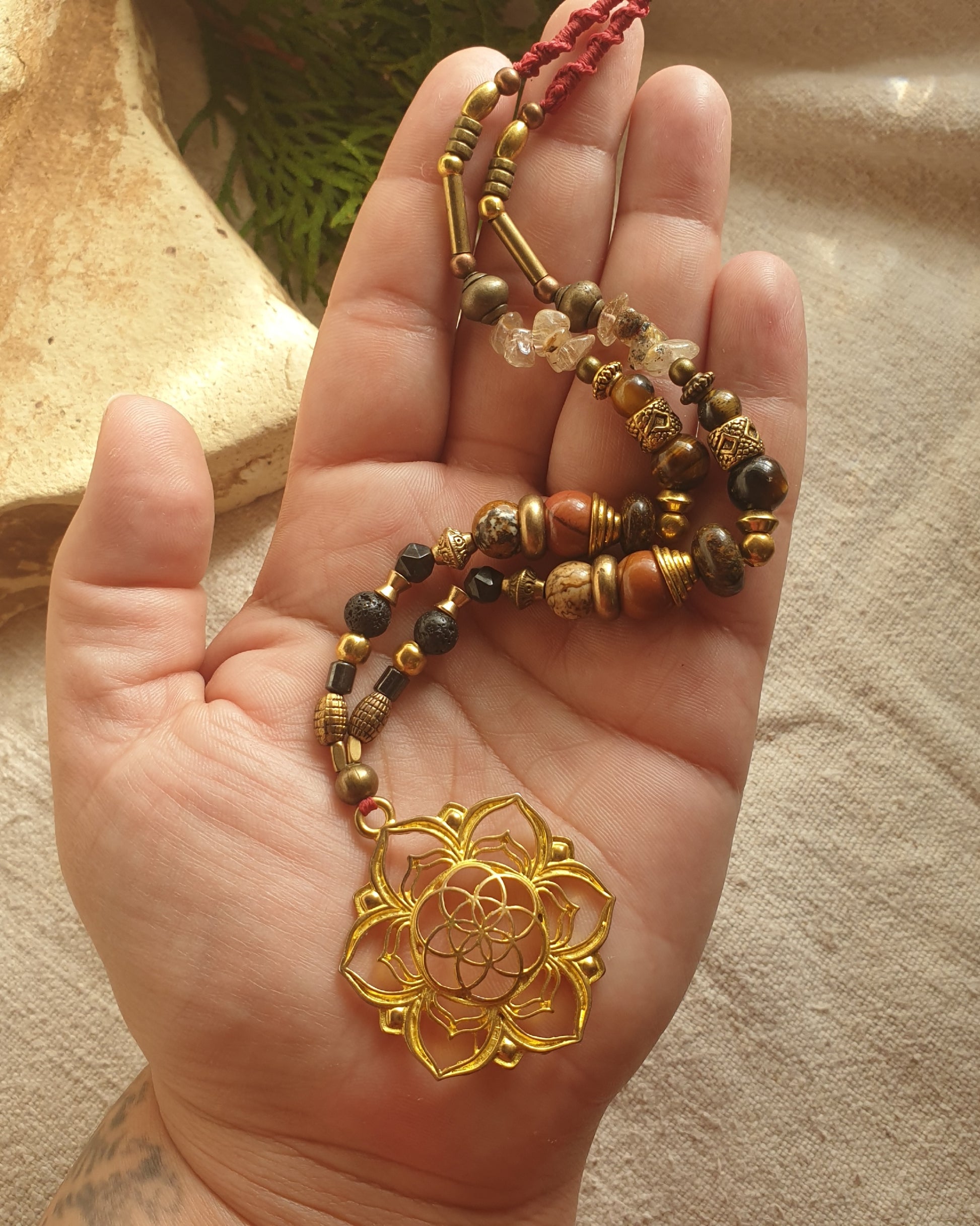 Ogrlica sjeme života, izrađena kombinacijom kristalnih perlica, metalnih elemenata od cinka, mjedi, bakra i makrame voštanog konca. Svaki komad pažljivo je ručno složen i jedinstven u detaljima i boji.
