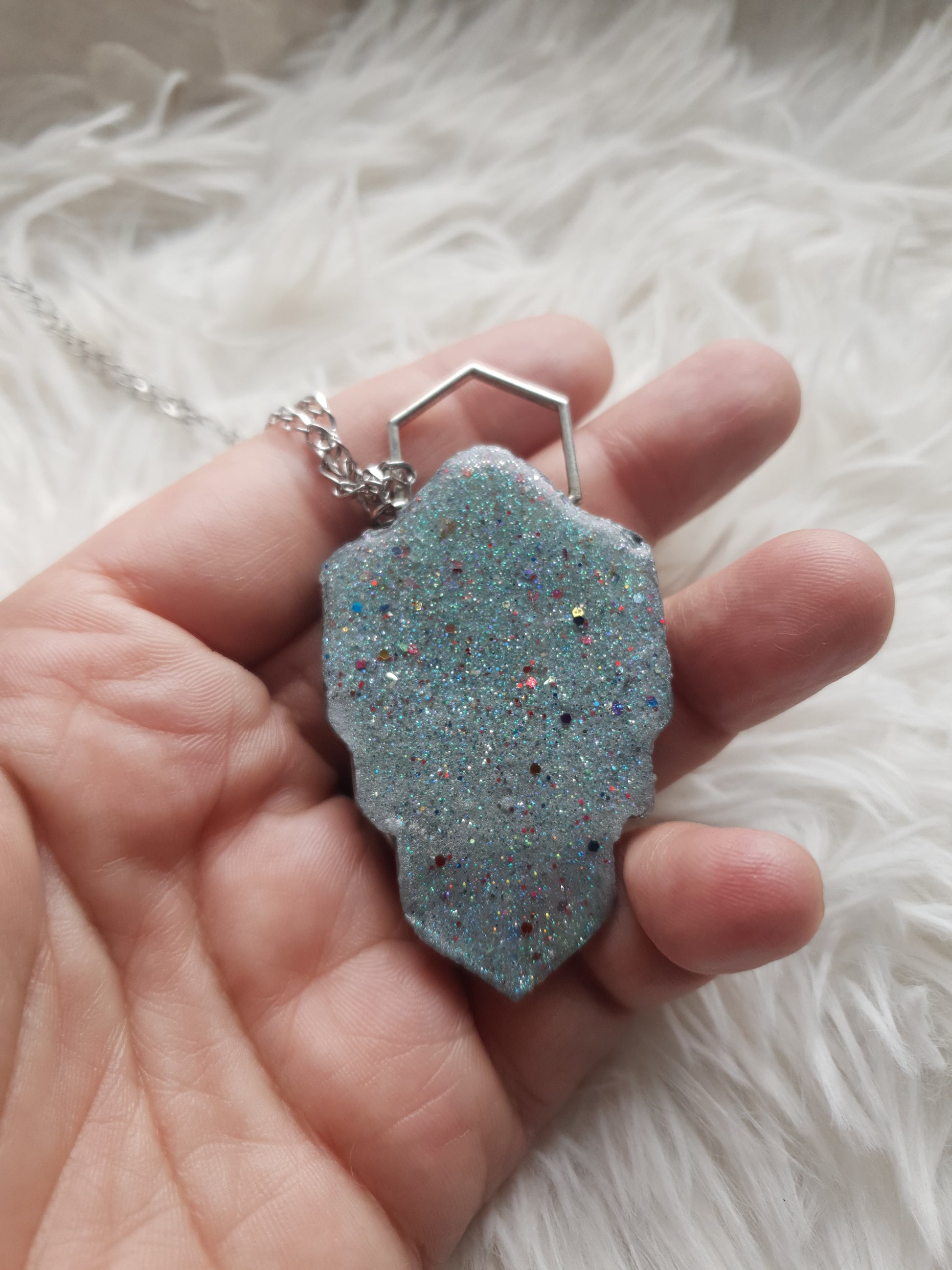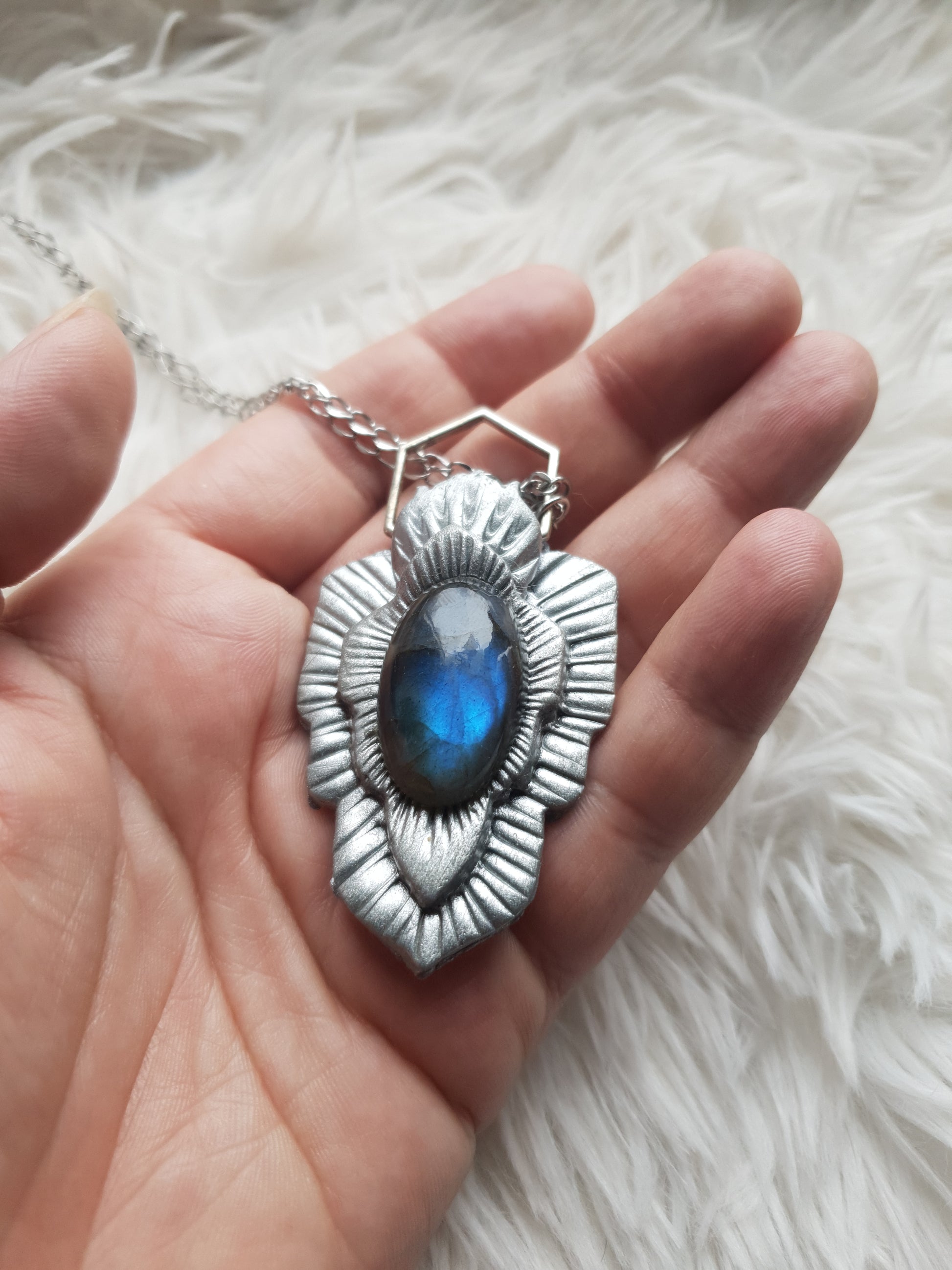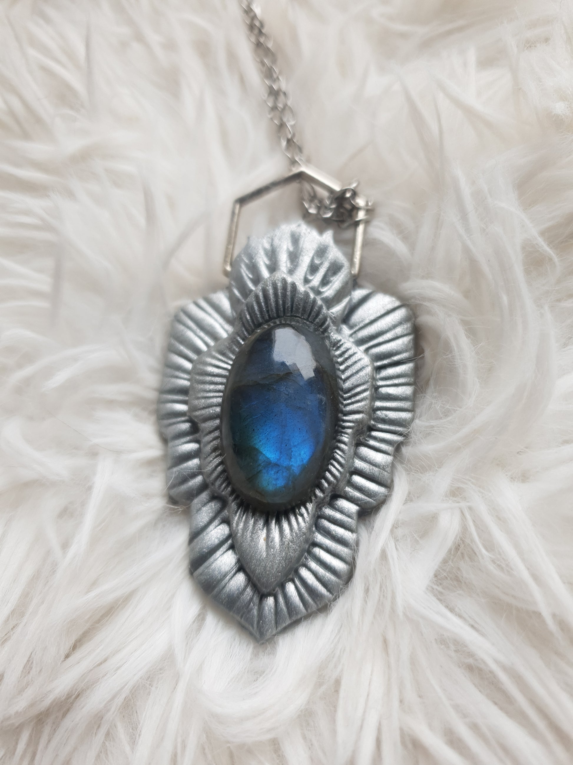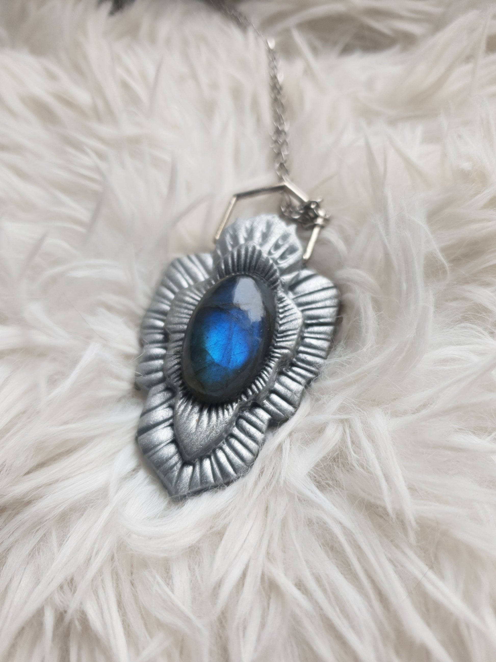 Unikatan ručno oblikovan privjesak od polimerske gline i plavog labradorita.