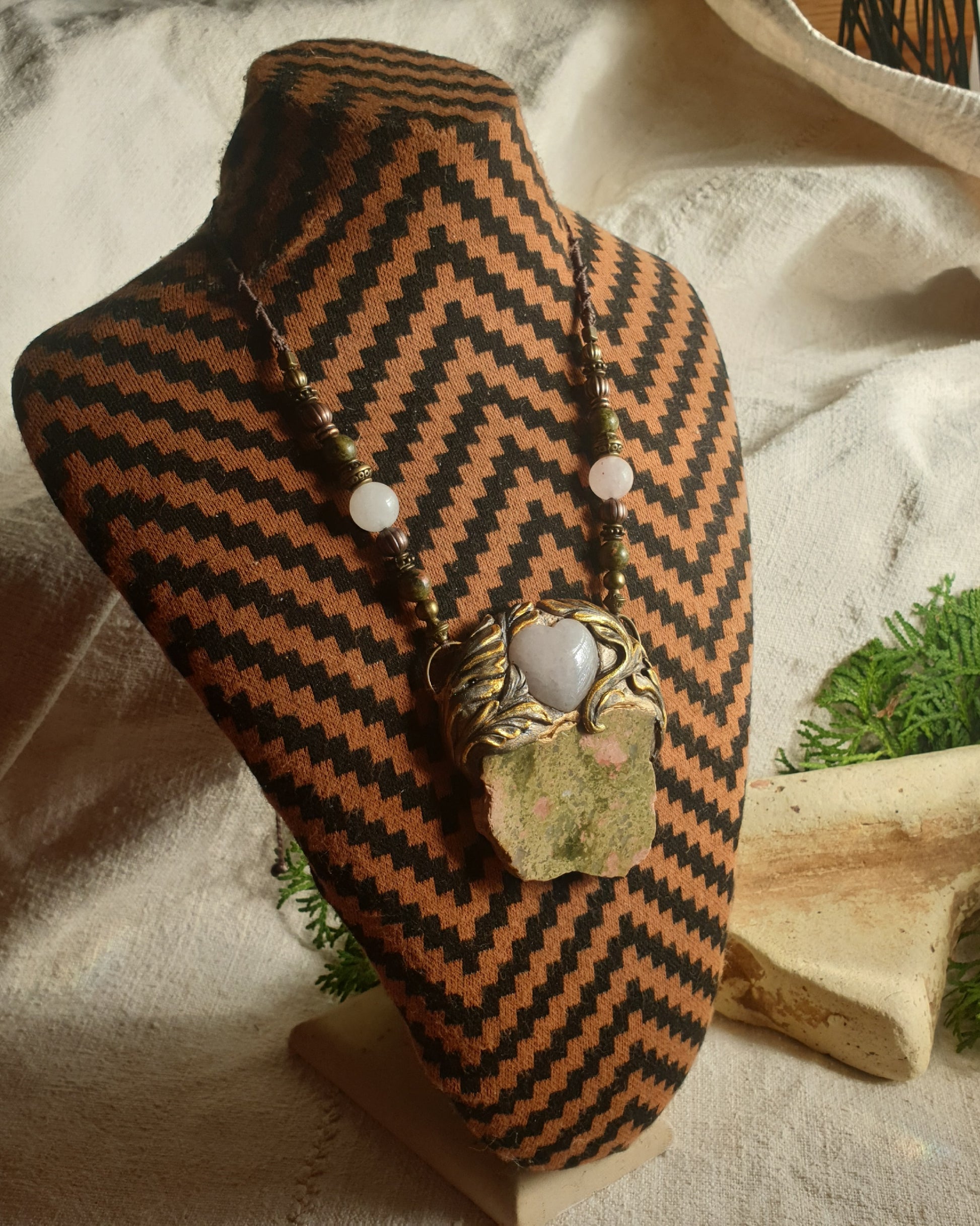 Unikatan nakit, izrađen od polimerske gline unakita i rozen kvarca . Svaki komad je ručno modeliran, te postavljen na makrame ogrlicu od kvalitetnog voštanog konca. Jedinstven spoj prirodnih elemenata, ručne izrade i organske estetike.
