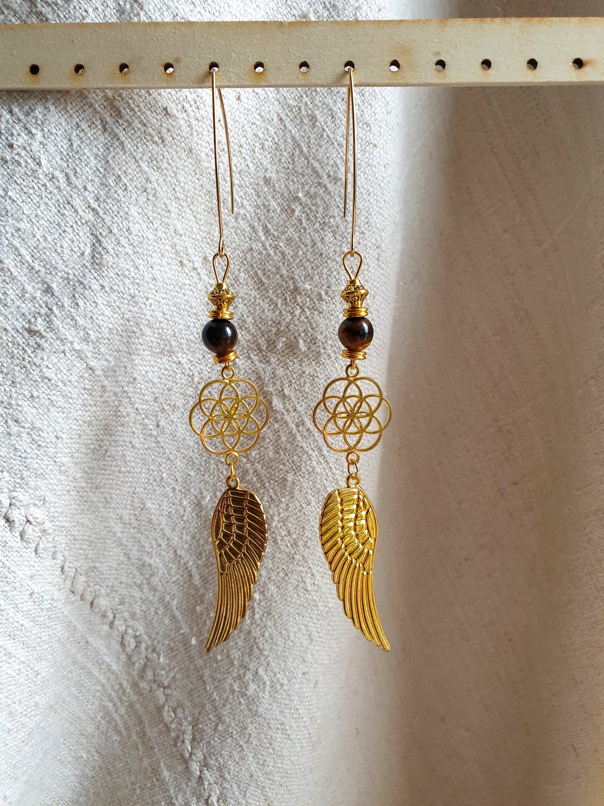 zlatno tigrovo oko naušnice - sjeme života - zlatna krila